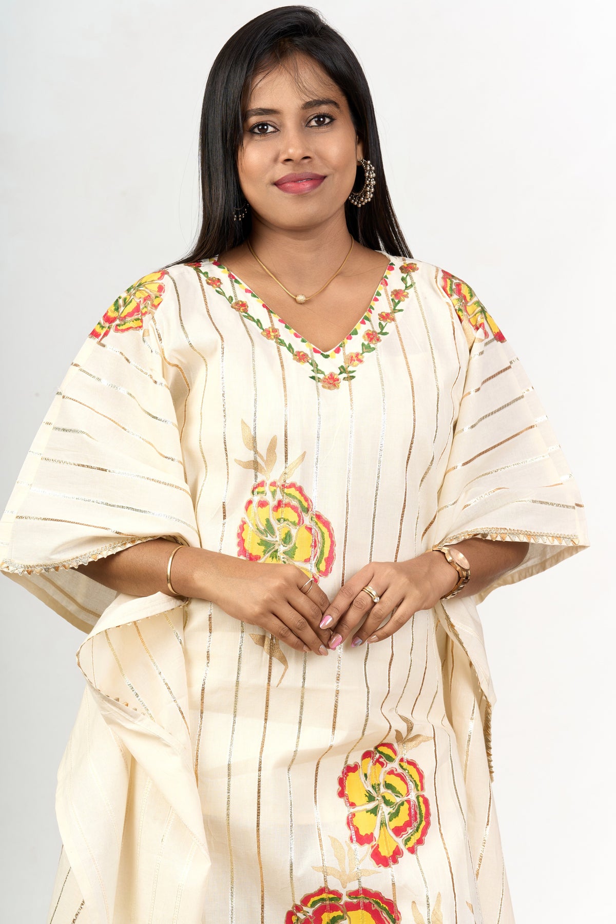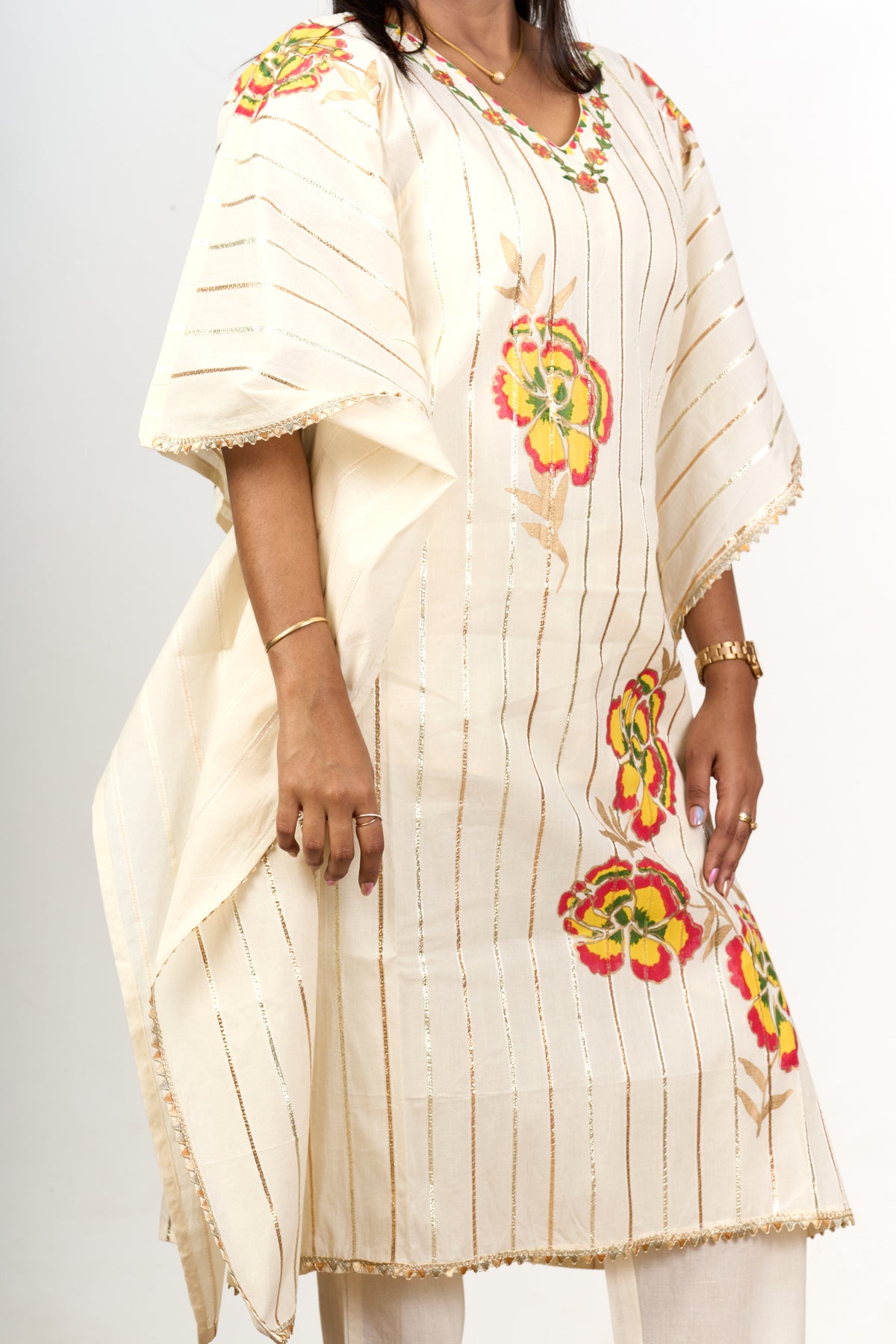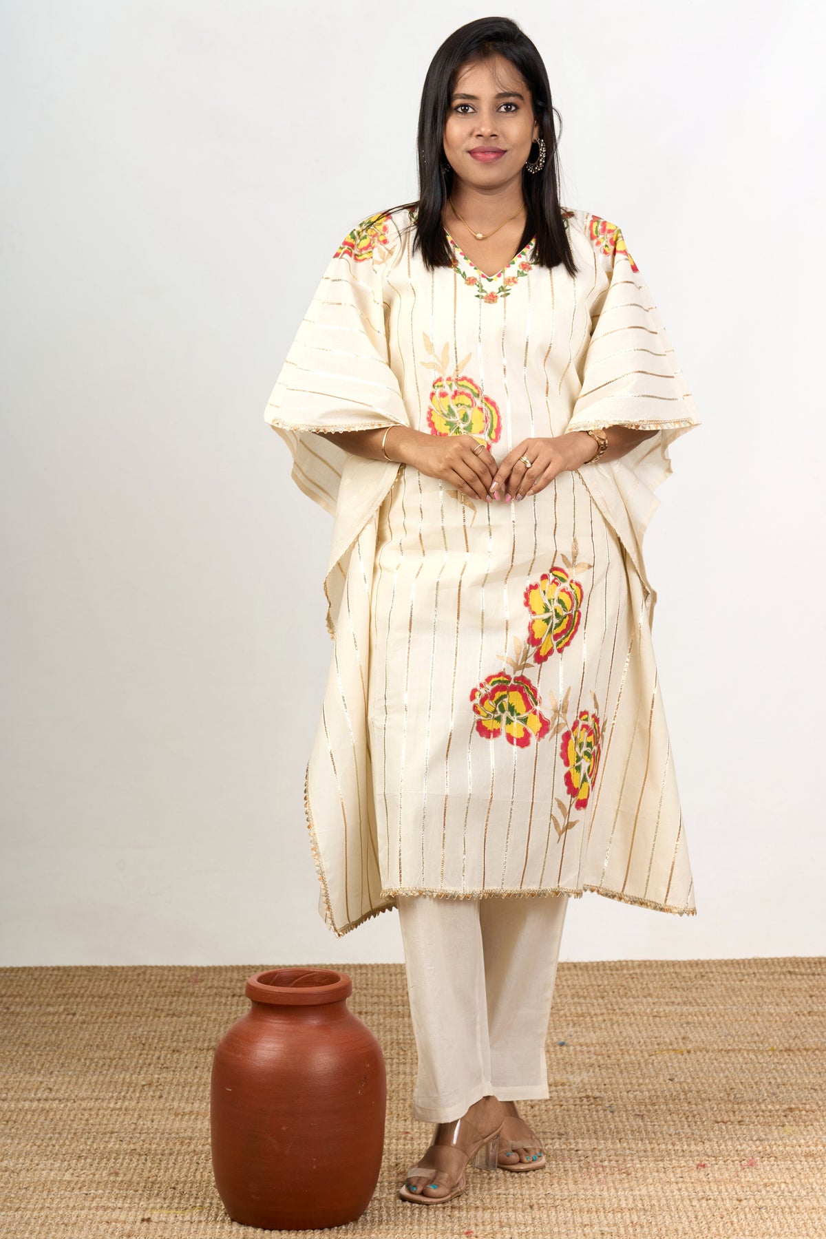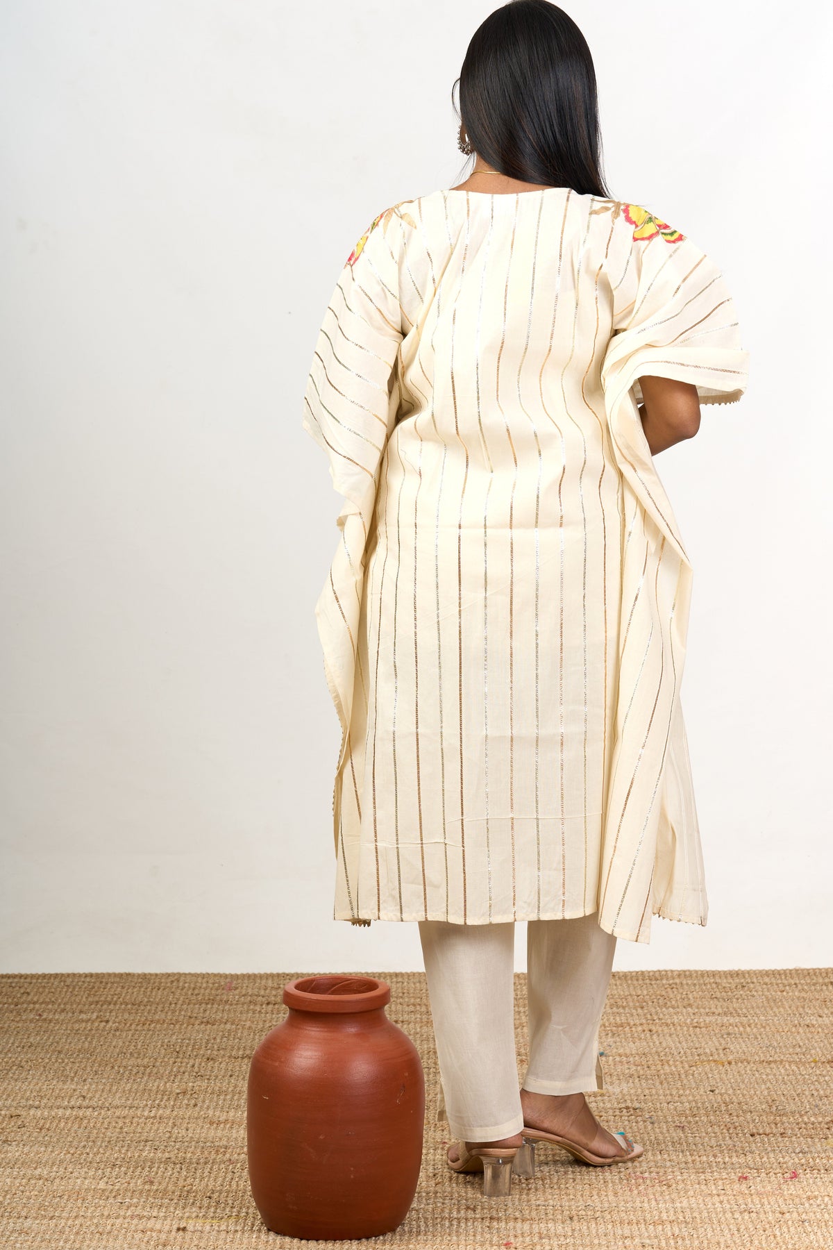 Discover understated elegance with this ivory co-ord dress set, crafted for women who value both style and comfort. Made from soft cotton, the tunic top features intricate floral embroidery and vertical striped detailing, offering a refined look. The relaxed-fit straight trousers ensure ease of movement, making this outfit ideal for festive occasions, intimate gatherings, or day events. Its flowy silhouette and minimalistic tones blend classic sophistication with contemporary charm. Pair this co-ord set with statement accessories and heels to create an elegant yet effortless ensemble.