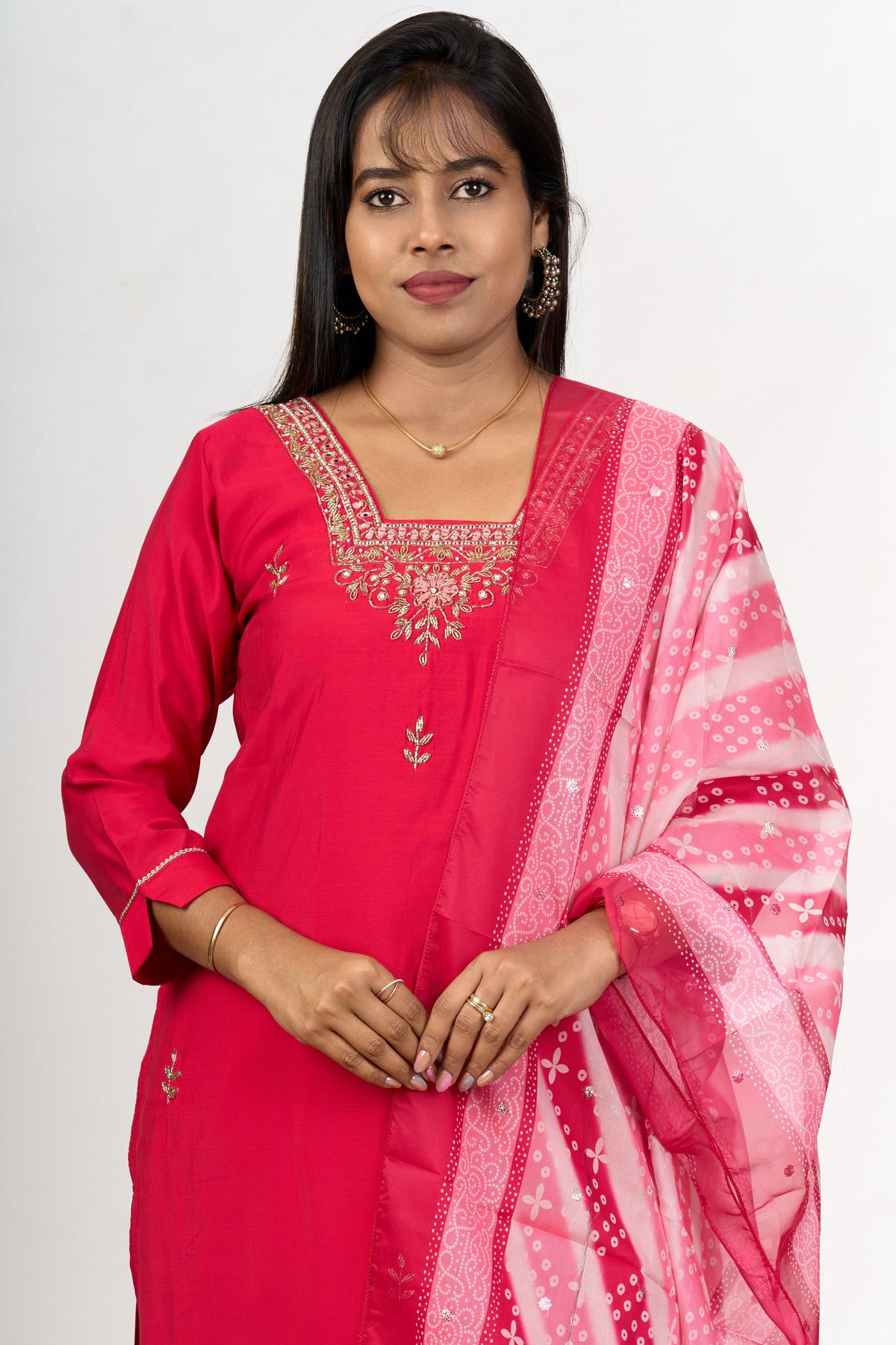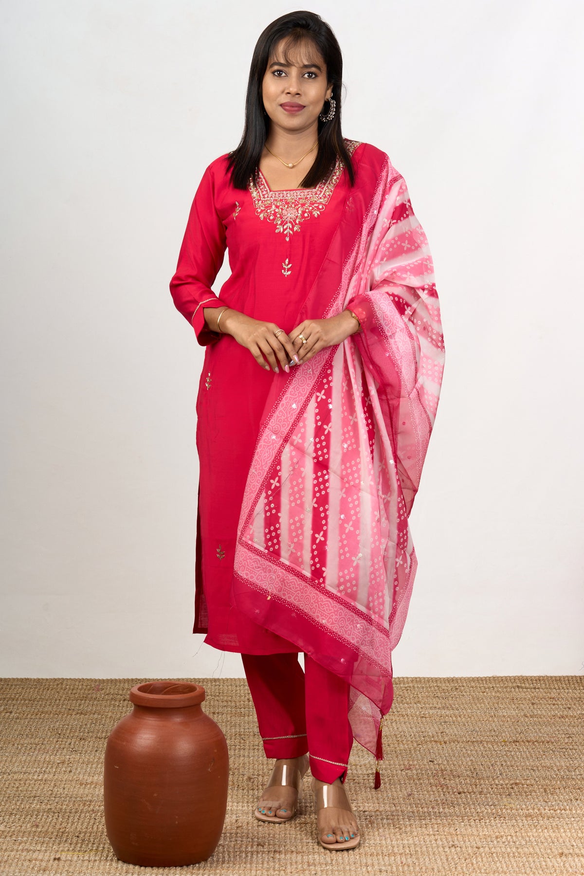 Embrace tradition with this gorgeous pant kurti dupatta set, designed in a rich red blend silk fabric. The kurti features exquisite gold embroidery on the neckline and sleeves, adding a regal touch to the outfit. Tailored pants ensure a comfortable fit, while the printed dupatta showcases bold patterns that beautifully complement the kurti. Perfect for Pongal celebrations or a formal holiday gathering, this outfit is a harmonious blend of elegance and practicality. The premium fabric offers breathable comfort, making it an excellent choice for day-long wear during festive occasions.