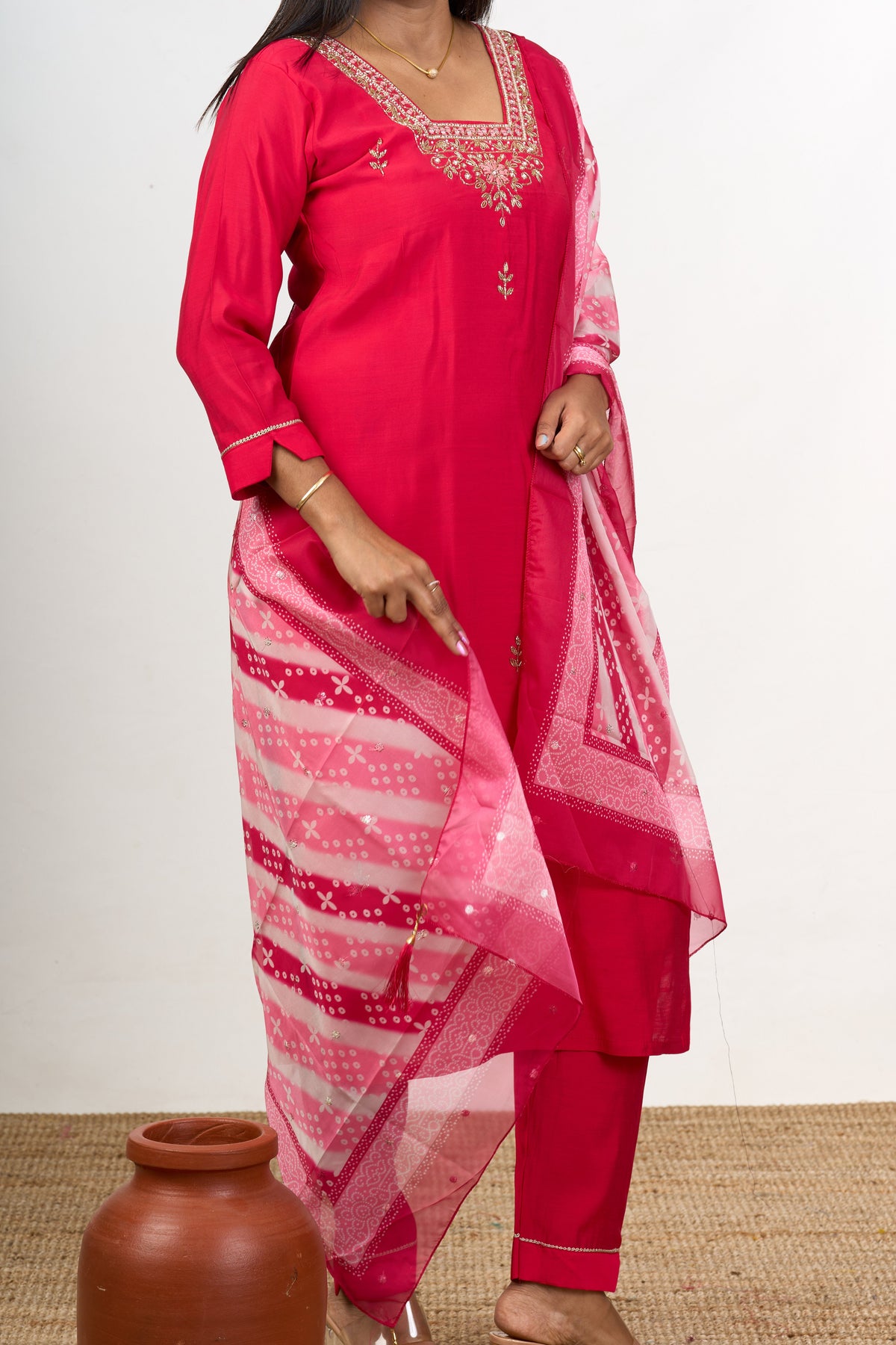 Embrace tradition with this gorgeous pant kurti dupatta set, designed in a rich red blend silk fabric. The kurti features exquisite gold embroidery on the neckline and sleeves, adding a regal touch to the outfit. Tailored pants ensure a comfortable fit, while the printed dupatta showcases bold patterns that beautifully complement the kurti. Perfect for Pongal celebrations or a formal holiday gathering, this outfit is a harmonious blend of elegance and practicality. The premium fabric offers breathable comfort, making it an excellent choice for day-long wear during festive occasions.