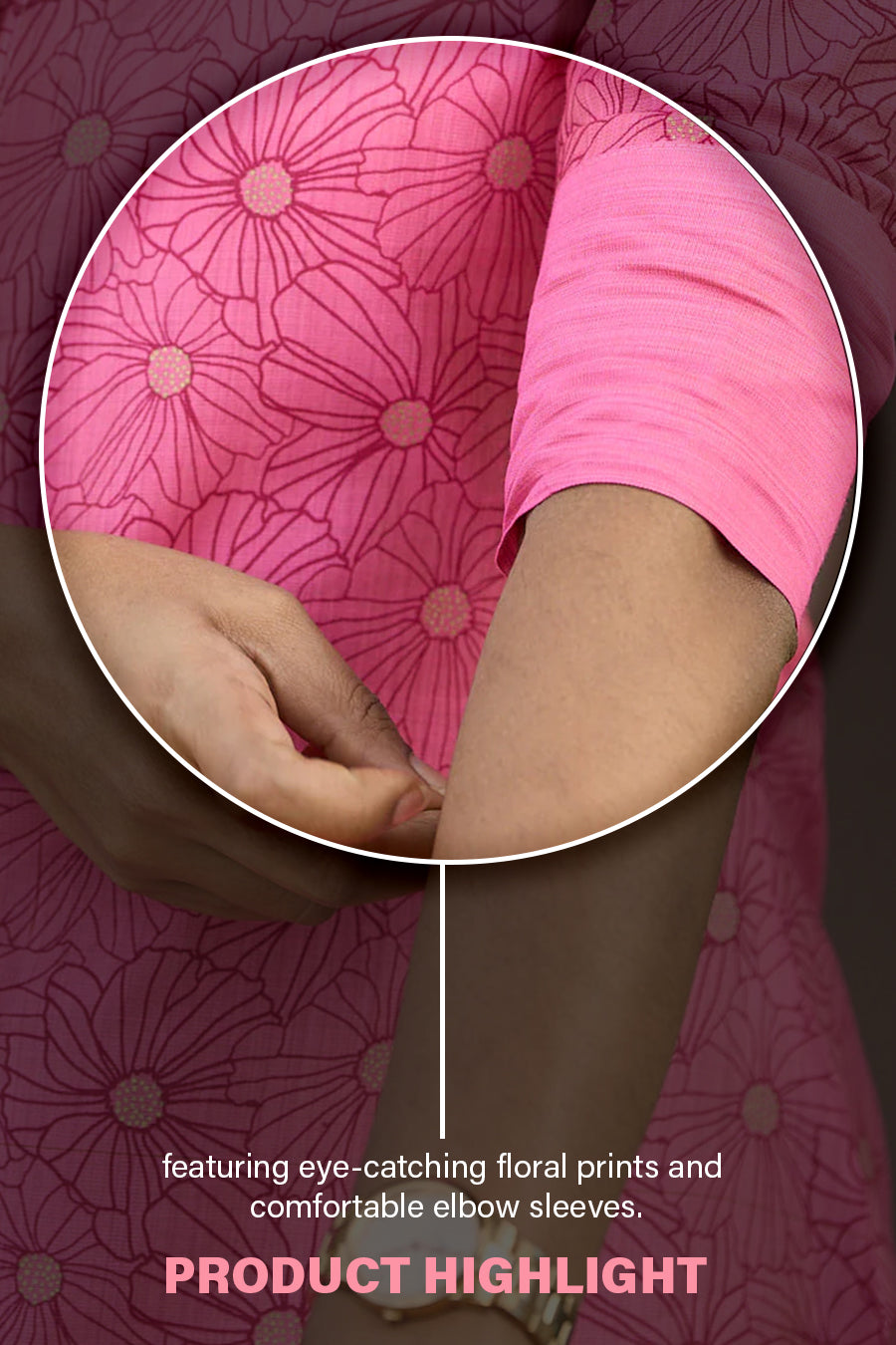 Add a touch of elegance to your wardrobe with this stylish pink kurti by Nesavu, tailored for the modern woman. Made from premium viscose silk, this kurti showcases a vibrant screen-printed floral pattern. The front-open design with button detailing and elbow-length sleeves creates a chic and versatile look, perfect for both casual and semi-formal settings.