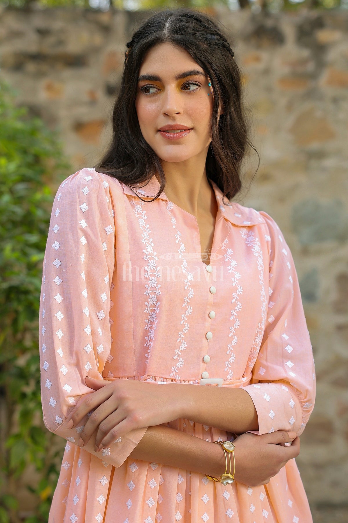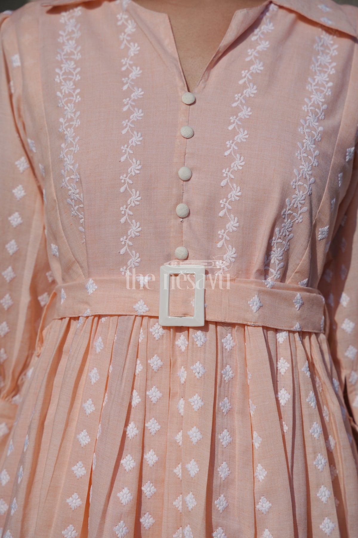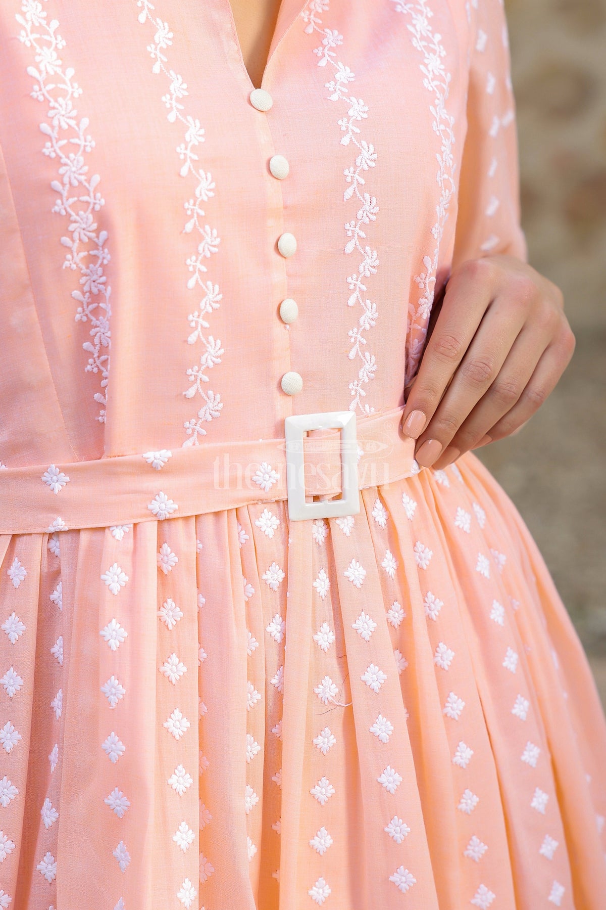 Unveil your playful side with Nesavu trendy peach womens elsa dress, tailored for the modern woman who appreciates elegance. Made from breathable georgette fabric, this dress features charming white embroidered accents over a soft peach base, creating a dreamy aesthetic perfect for spring festivals or family photo shoots. The pleated skirt flows gracefully, enhancing its twirl-worthy appeal, while the structured bodice with a collared neckline and three-quarter sleeves adds a sophisticated touch. A fabric belt cinches the waist to create a flattering silhouette, combining style and comfort seamlessly. Ideal for tea parties or casual gatherings, this dress is an ode to timeless femininity and modern chic.