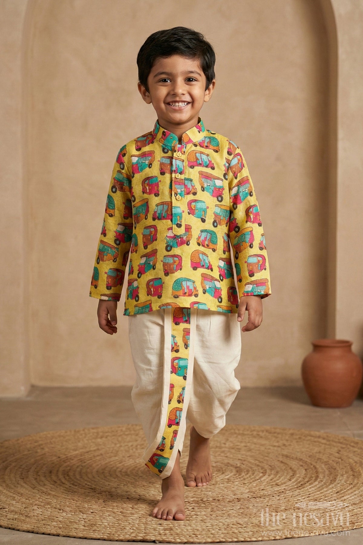 This Boys Dhoti Set is a playful traditional outfit with a modern twist. The bright yellow kurta features a fun and vibrant auto-rickshaw print, giving it a quirky and energetic feel. Paired with an off-white dhoti, the set offers a blend of traditional style and contemporary charm. The mandarin collar and half-button placket add a classic touch, while the printed strip on the dhoti ties the look together perfectly. This outfit is ideal for cultural events, family gatherings, or festive celebrations, ensuring both comfort and style.