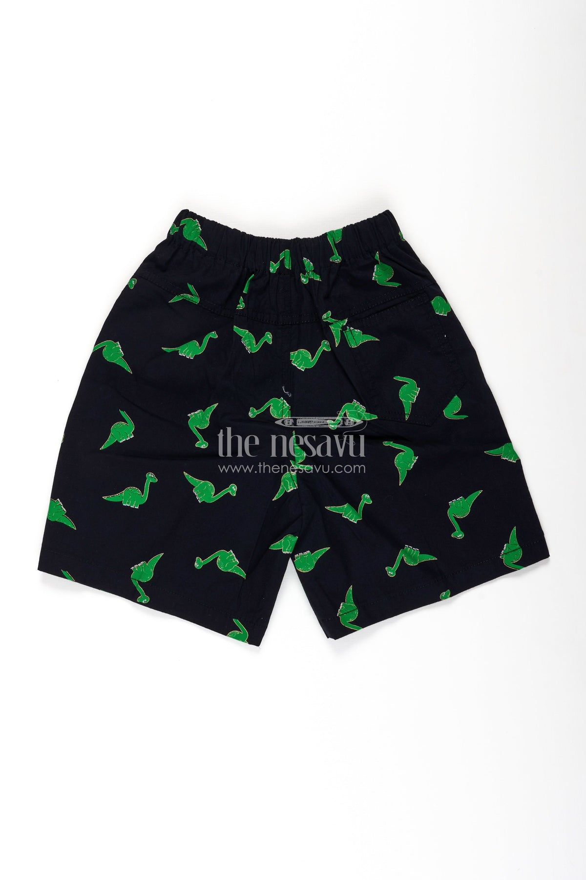Boys Black Cotton Drawstring Shorts with Bright Green Dinosaur Print and All Over Comfort Design