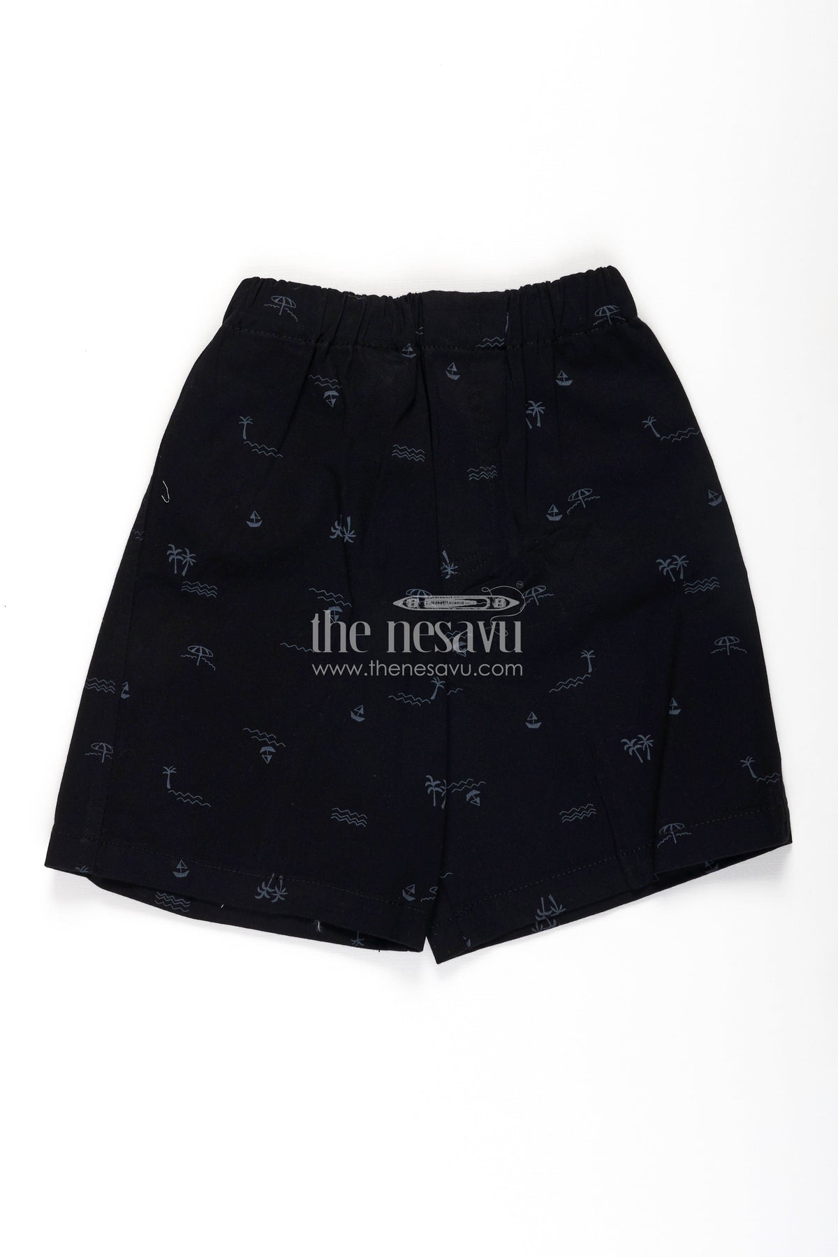 Boys Black Cotton Little Shorts with Beach Theme Digital Print and Soft Fit Elastic Waistband