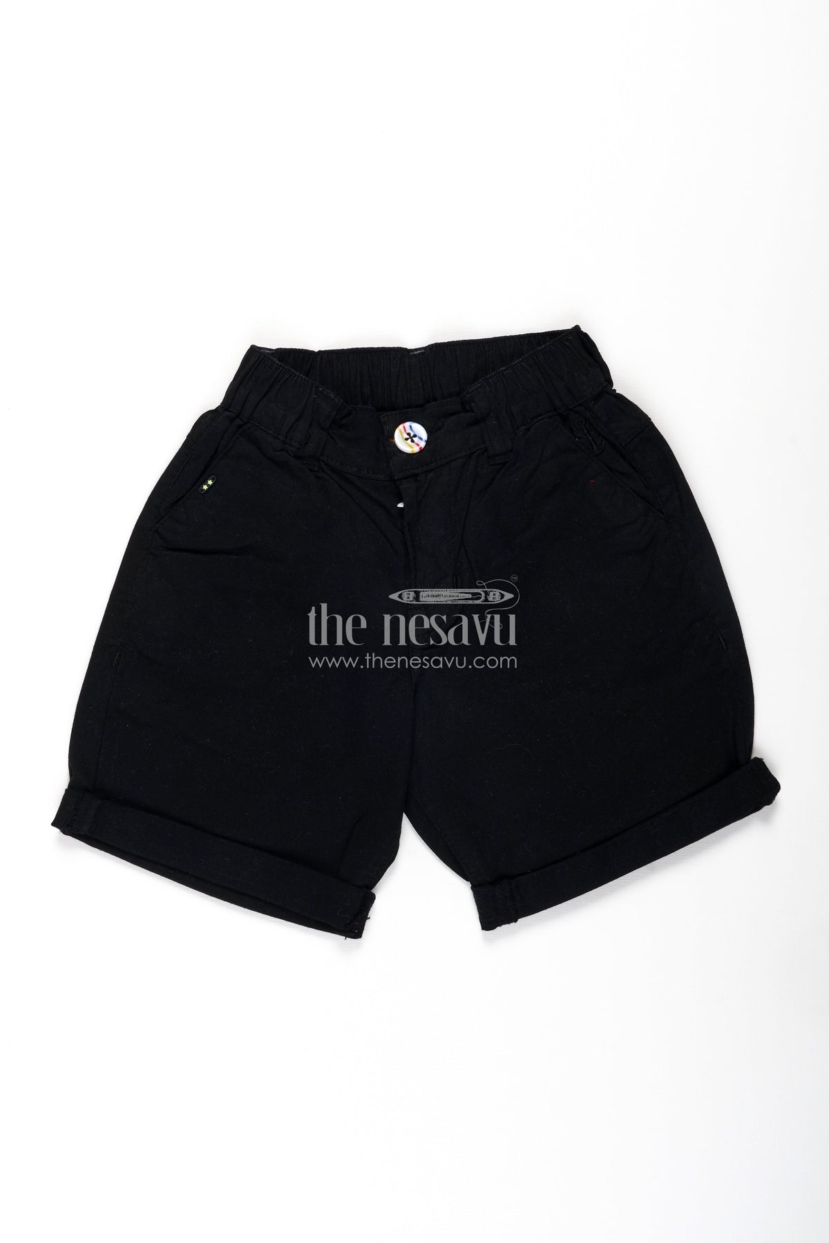 Childrens black shorts by Nesavu are classic, easy-to-style bottoms made from high-quality cotton for breathability and comfort. These all-black shorts feature subtle turned-up hems and a stretchable waistband with a belt loop for added adjustability. Whether for school, casual hangouts, or relaxed evenings, these shorts offer versatile wear. Designed to keep up with active kids, they combine comfort, simplicity, and subtle detailing that never goes out of style.