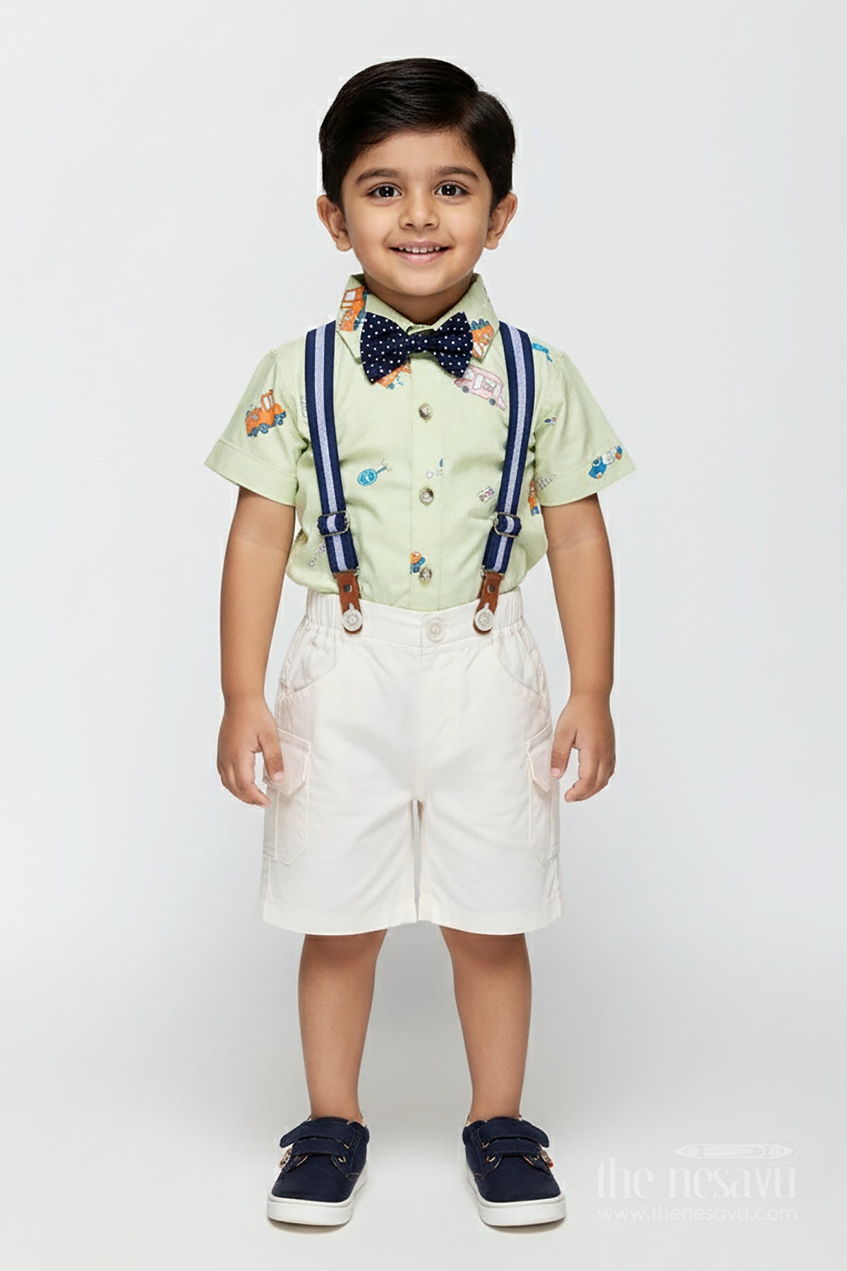 Let your child explore in comfort and charm with this cheerful baby boy light green outfit from Nesavu. The printed shirt features delightful vehicle motifs on a light green base and comes with a cute black polka-dotted bow tie. Crafted from cotton with digital print, the shirt is paired with stylish off-white cargo shorts, complete with suspenders for a classy flair. Whether it's a family brunch or an afternoon in the park, this set ensures your little boy stays comfy and photo-ready all day long.