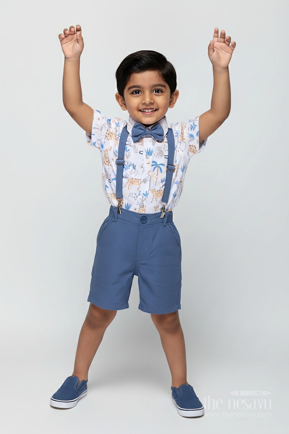 Baby Boy Stylish Summer Look with Blue Animal Print Shirt and Grey Shorts with Suspenders