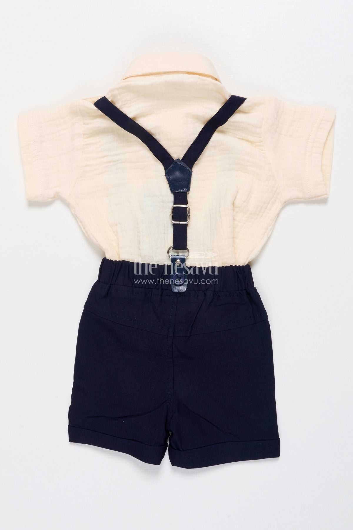 - Made in soft muslin cotton, the set includes a short-sleeve shirt, bow tie, and suspenders