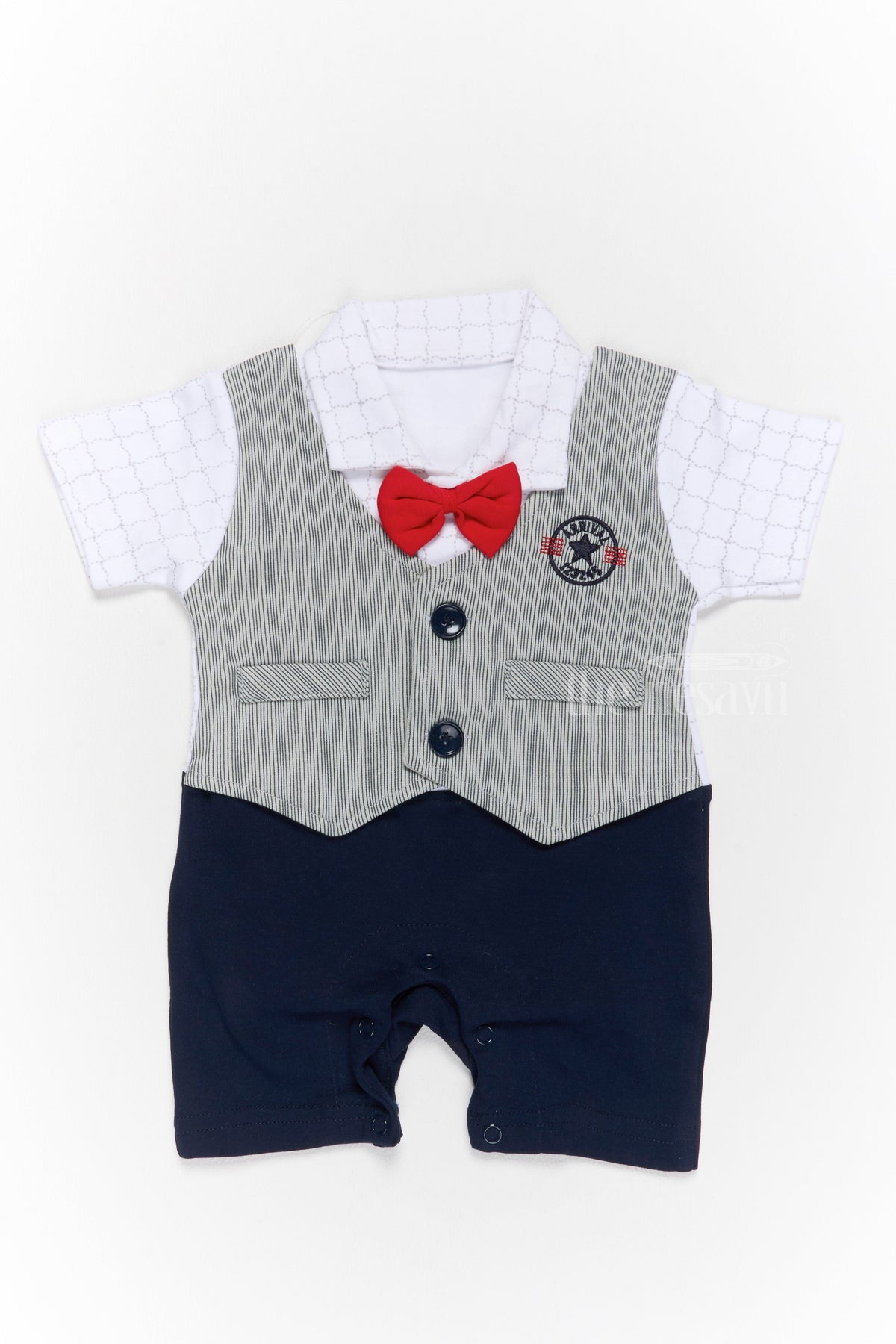 This baby boys casual party outfit is designed to bring out the best of style and comfort. The set features a crisp white cotton shirt with a subtle grid pattern, layered with a grey striped vest for a polished look. The vibrant red bow tie adds a fun and festive touch, making this outfit ideal for celebrations, birthday parties, or formal events. Completing the look are black shorts tailored from soft cotton, ensuring maximum comfort for your little one. The outfit is designed with snap-button closures for easy dressing and diaper changes. With its breathable fabric and timeless design, this outfit is a perfect combination of practicality and elegance for your baby boy.