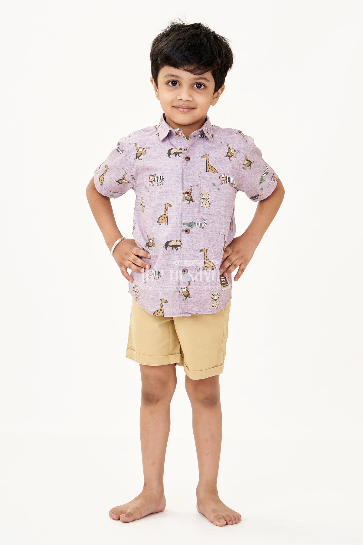 Let your little explorer shine in this adorable best casual wear boys' outfit designed for style and comfort. The set includes a cotton short-sleeve shirt featuring fun animal-themed digital prints, a soft white graphic tee with a safari-inspired illustration, and mustard yellow shorts. The playful color palette and theme make it a perfect choice for everyday adventures, from zoo trips to playground fun. Made with soft, breathable cotton, this three-piece set allows full freedom of movement while keeping your child cool and stylish.