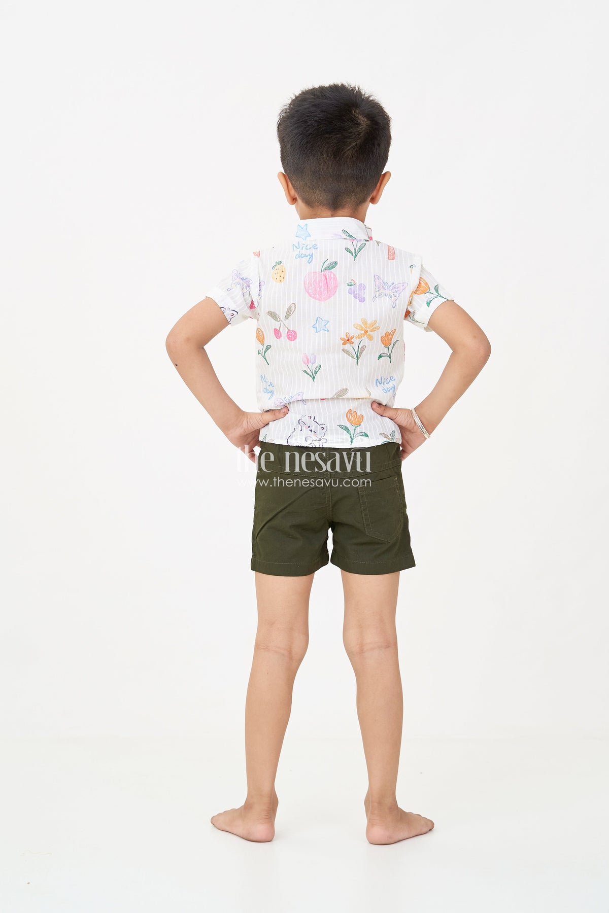 Bring a burst of cheerful energy to your boy’s wardrobe with this casual summer wear set, perfect for outdoor play or relaxed vacation looks. Featuring a short-sleeved button-down shirt with colorful digital prints of fruit, butterflies, and flowers, it’s paired with solid black shorts that are easy to style and comfortable to wear. The cotton fabric ensures a breathable fit on warmer days. With its playful aesthetic and easygoing comfort, this set is ideal for sunny strolls and fun outings.