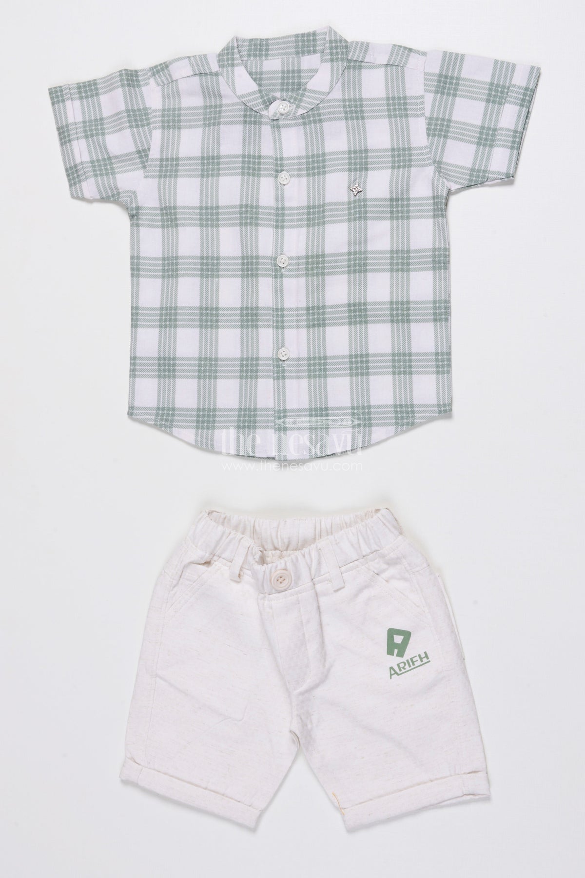 - This boys casual set includes a sky-blue checked cotton shirt with soft cream shorts