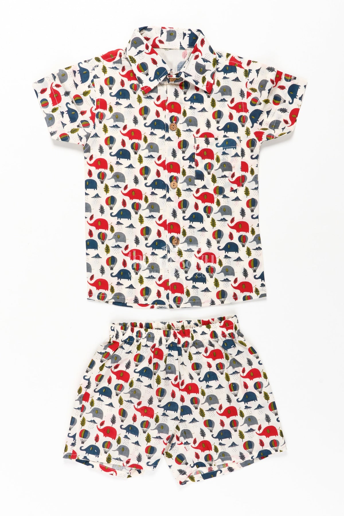 Let your boy express his style with this cotton casual shirts set that’s both creative and comfortable. Featuring vibrant elephants and balloon prints in bold shades of red, navy, and olive green, this cream cotton ensemble includes a smart collared shirt with front buttons and coordinating shorts. The short sleeves and lightweight design make it a top pick for warm-weather play or daily adventures, combining whimsical style with reliable comfort.