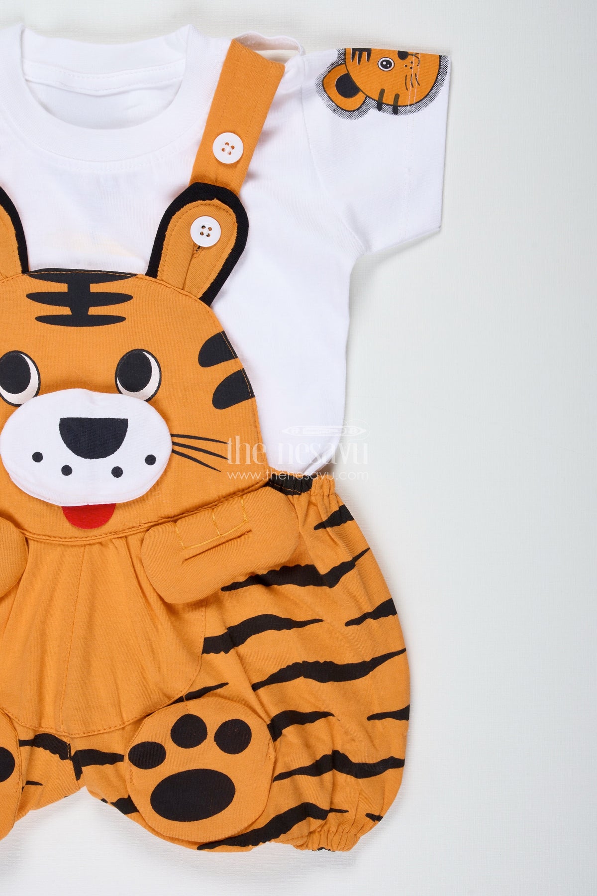 Orange shirt and short sets for little boys don’t get more delightful than this cotton combo featuring a vibrant animal-themed dungaree over a soft printed tee. The orange dungaree has animated tiger-like prints and a front animal face design that instantly grabs attention. Paired with a matching white short-sleeved t-shirt, this outfit is designed for maximum comfort and charm. The breathable cotton fabric keeps your little one cool during active play, while the dungaree straps provide a secure yet flexible fit. This set is perfect for playdates, everyday wear, and fun family days out, offering both style and ease.