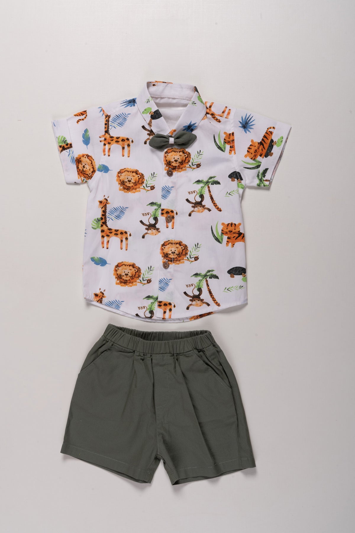 print design on shirt brings the playful charm of the jungle right into your child’s wardrobe with this boys cotton casual set. The shirt features a vibrant animal-themed digital print with lions, giraffes, tigers, and more, capturing the imagination of every young explorer. Crafted from soft and breathable cotton, the shirt ensures day-long comfort and comes paired with solid olive green shorts that are elasticated for a perfect fit. This set is ideal for curious kids who love style and movement, combining practical comfort with eye-catching design. The classic button-down front with an adorable bowtie adds a touch of sophistication to this otherwise fun outfit. Whether it’s for playdates, outdoor adventures, or casual family outings, this set delivers comfort, durability, and whimsical style in every stitch.