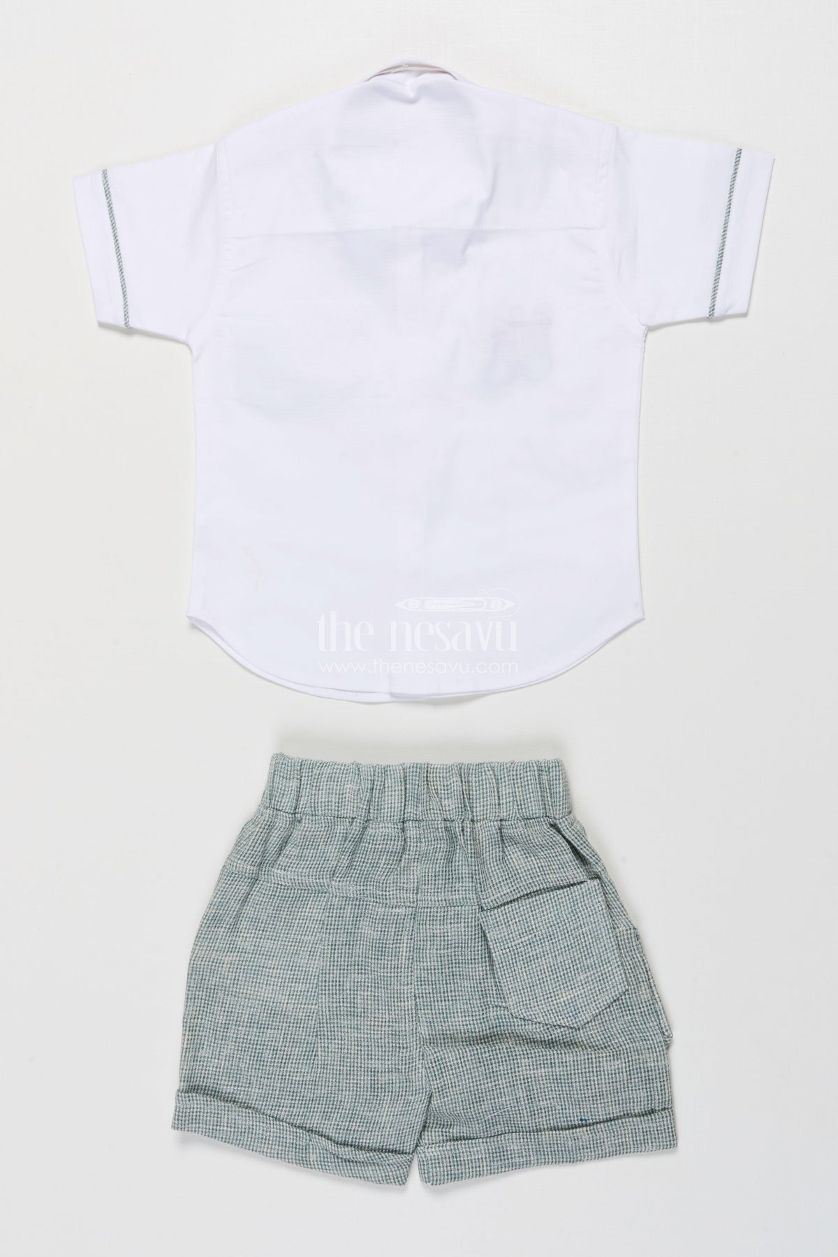 - Features a short-sleeve shirt with classic buttons and matching shorts