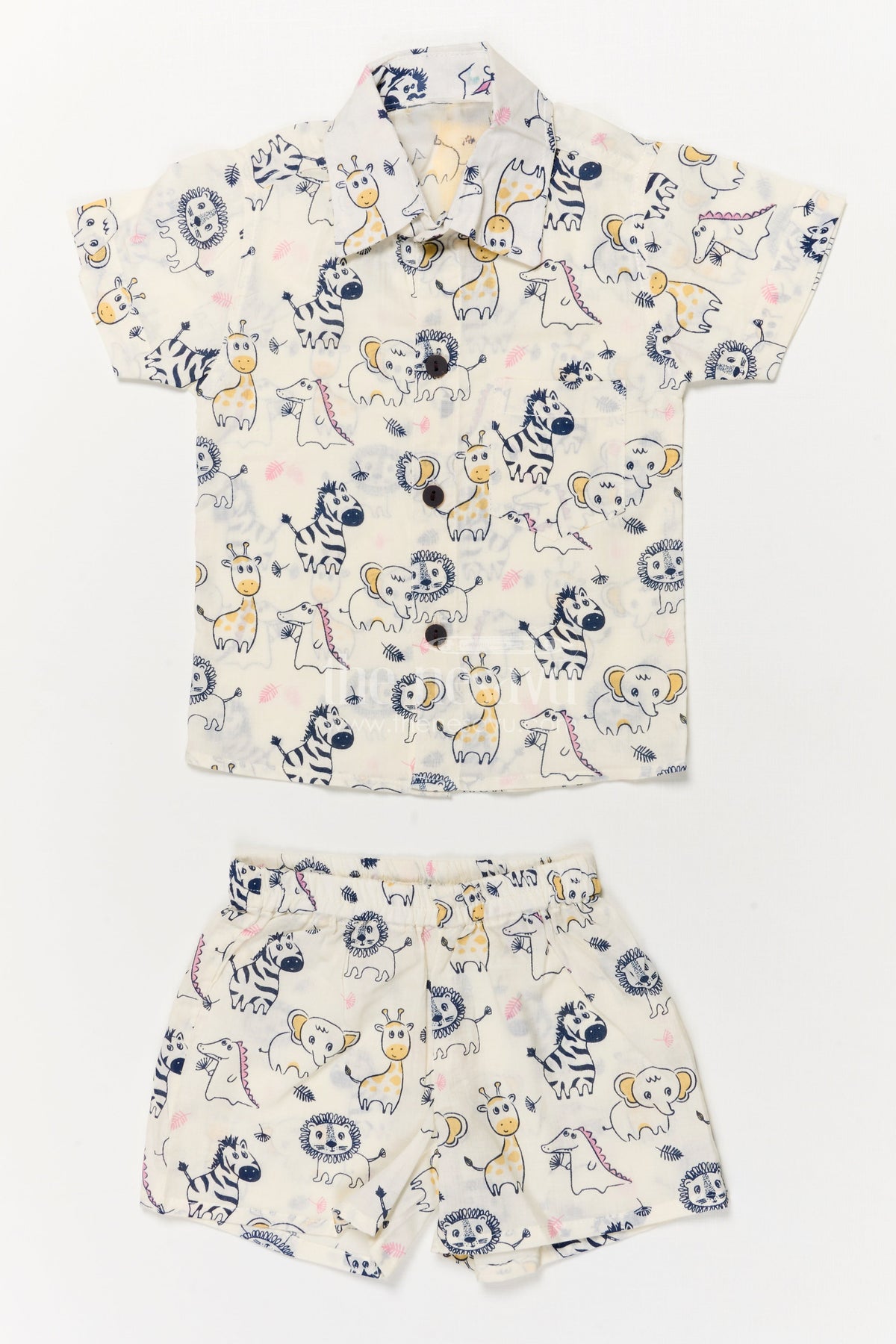 - Design: Animal digital print, collared shirt with shorts