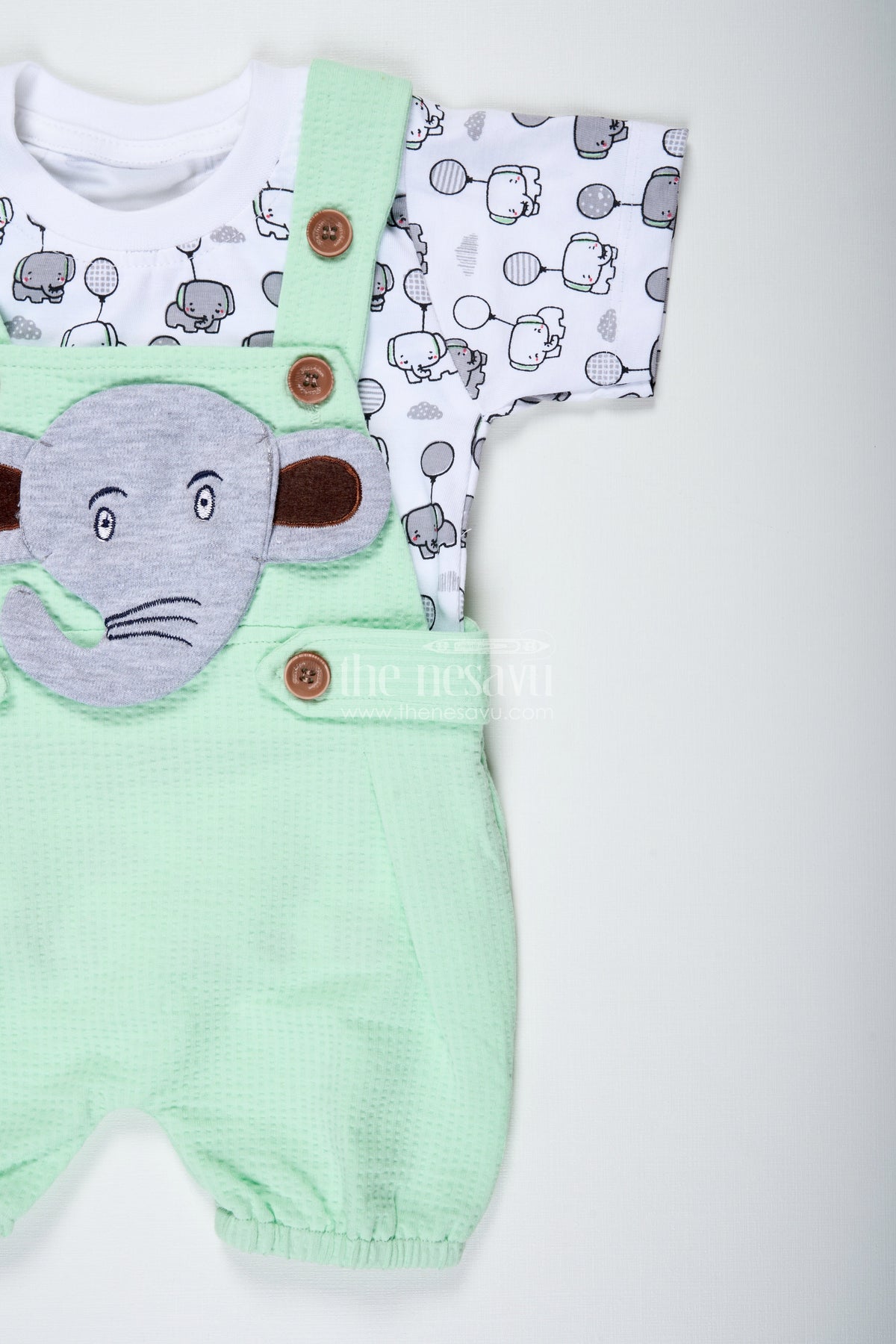 Boys Elephant Newborn Outfit in Cotton Waffle Knit with Mint Green Overalls and Printed Tee for Soft Comfort