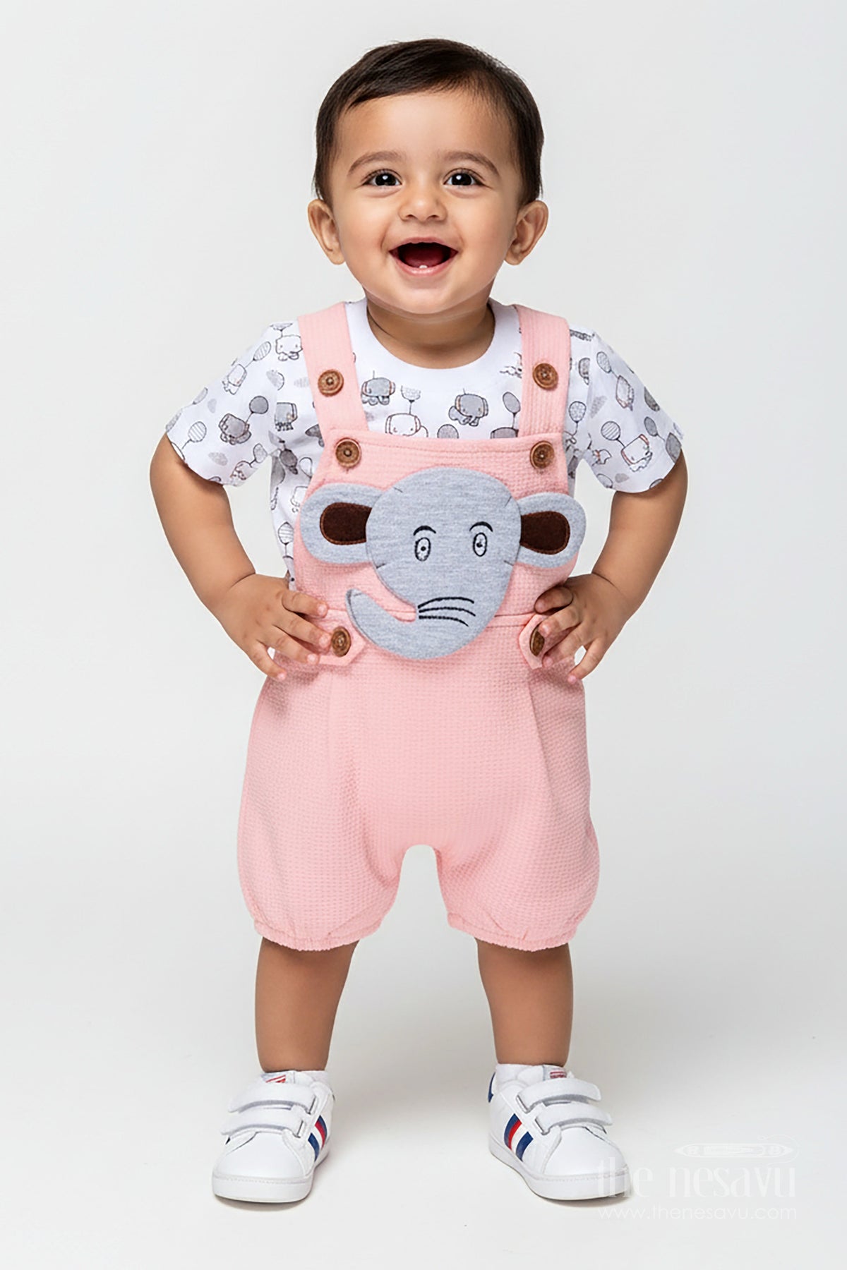 Boys Elephant Print Dress in Cotton Waffle Knit with Pink Overalls and Character Embroidery for Everyday Style