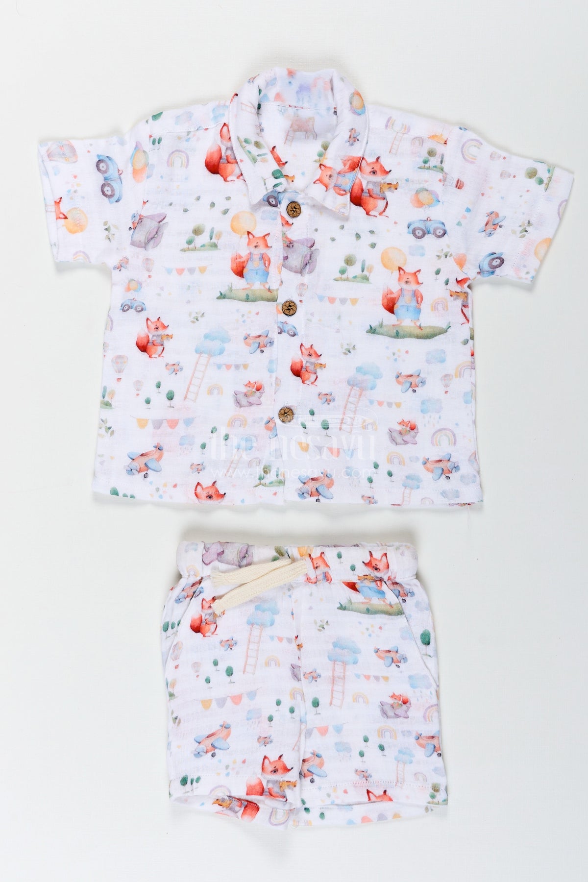 New fashion casual shirts just got an adorable update with this boys set featuring playful woodland animal prints. Crafted from ultra-soft muslin with digital print, this outfit includes a short sleeve shirt with charming fox illustrations and pastel-colored details like clouds, trees, and bunting flags. The breathable fabric ensures all-day comfort while the easy front buttons and coordinating shorts with drawstring waist provide both style and function. The relaxed fit supports all the running, jumping, and exploring little boys love to do. Whether it’s a playdate or a casual day out, this cute and practical set is a must-have in any kid’s wardrobe.