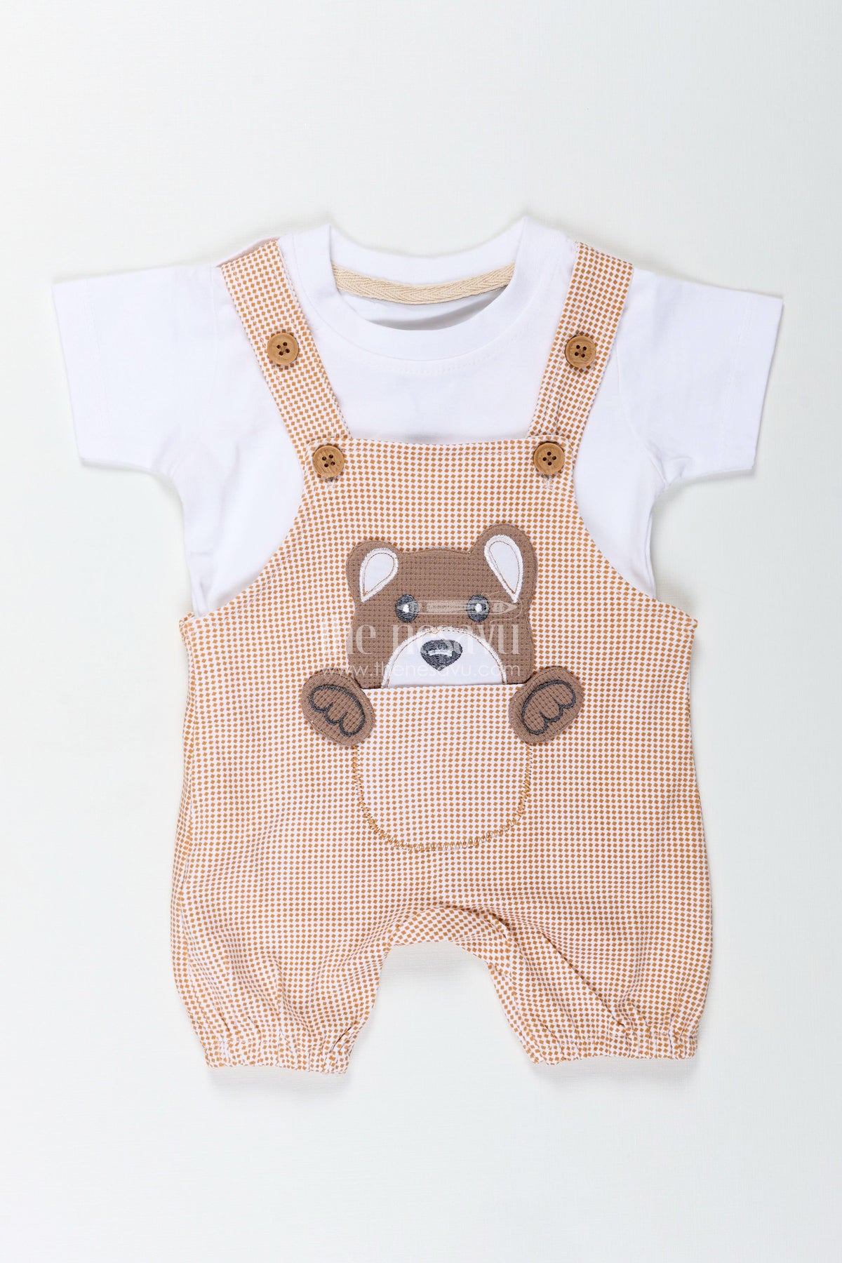 Boys Newborn Small Sleeve Romper Set with Bear Patch and Beige Striped Overalls in Soft Cotton Comfort