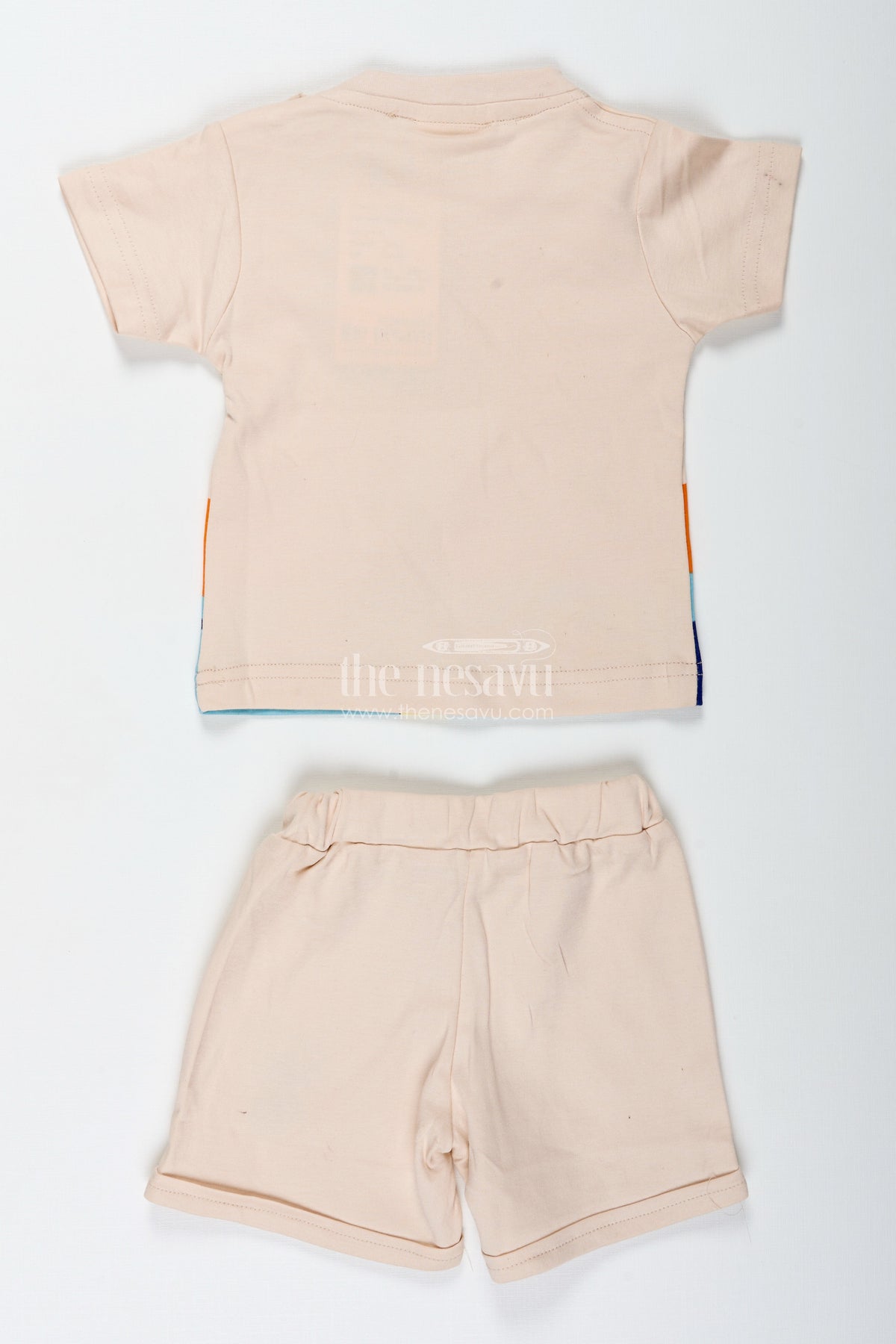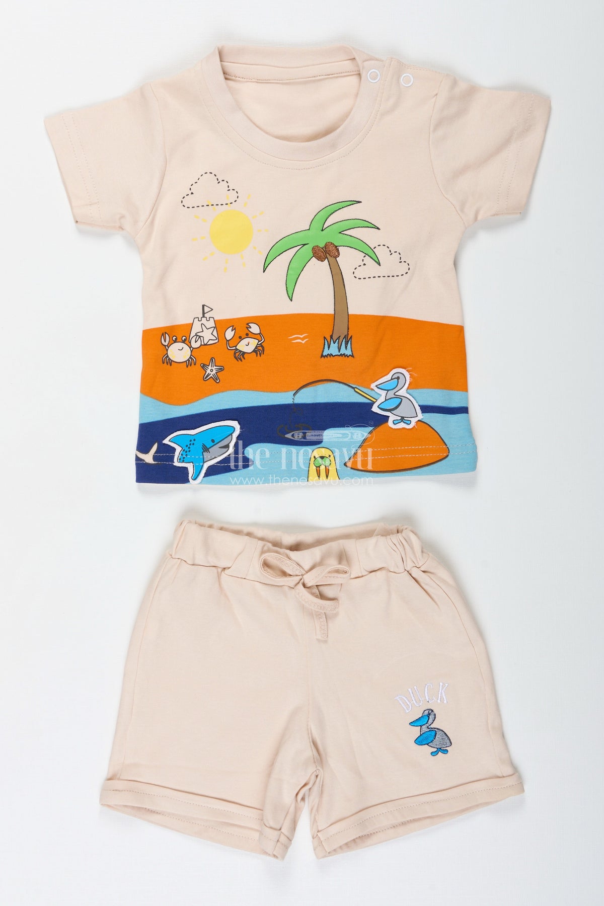 The palm tree shirt and shorts set brings sunny vacation vibes to everyday dressing for boys. Made from cotton with digital print, this outfit features a tropical-themed top adorned with palm trees, a beach scene, and bright ocean colors that inspire playful moods. Paired with light beige shorts, the set is breathable, soft, and ideal for warm weather. Designed for ease and comfort, it provides a relaxed fit that supports play, strolls, or laid-back lounging. The digital print adds vivid detail, making this set a standout in any casual wardrobe. It’s the perfect pick for tiny adventurers who love bright and cheerful designs.