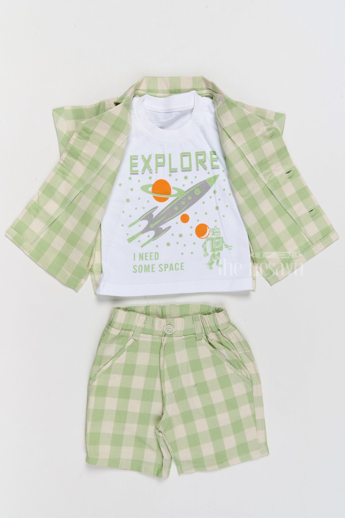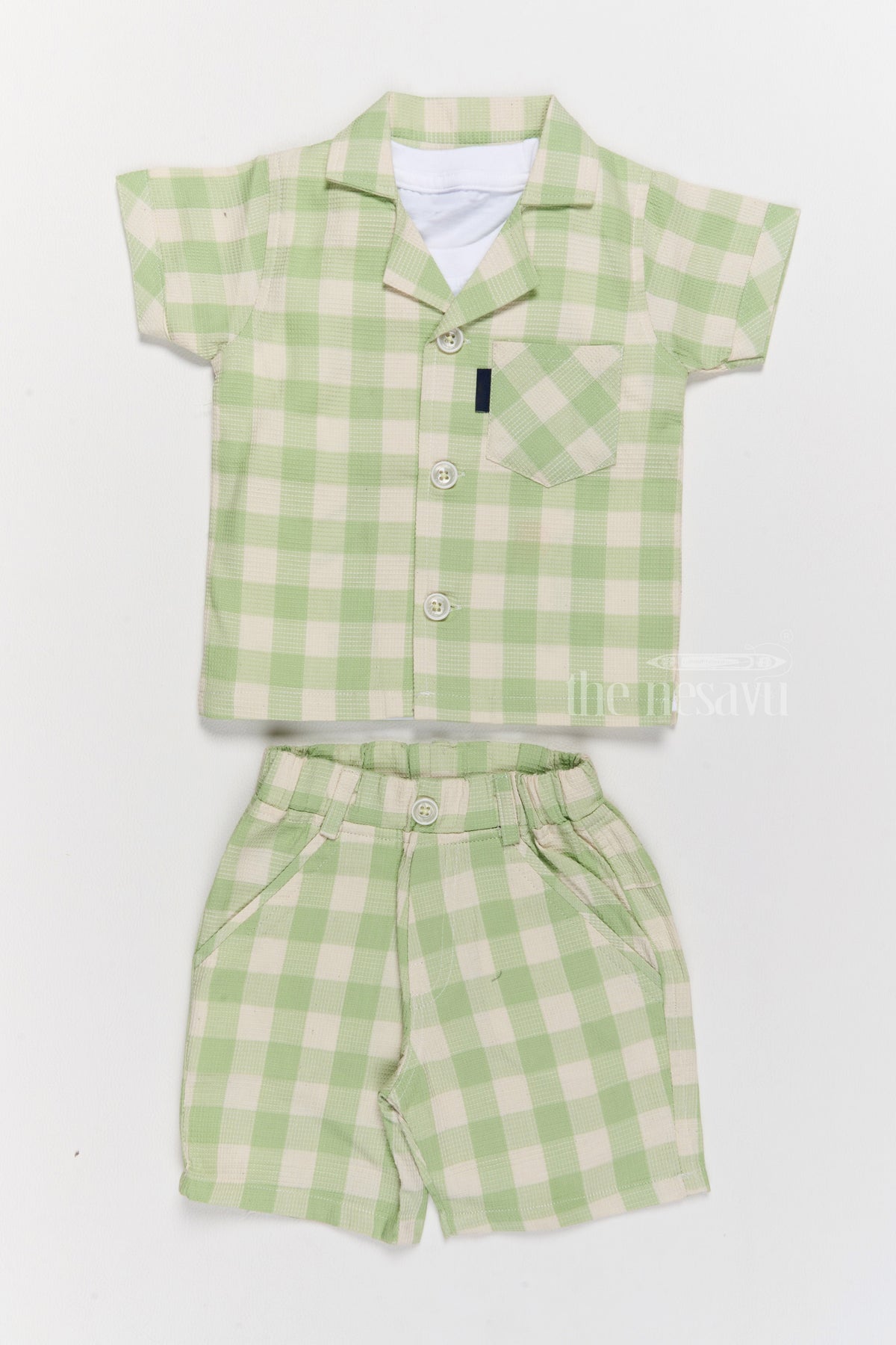 This boys party wear dress set combines playful style with a sophisticated touch, featuring a green and cream checked short-sleeve shirt and matching shorts. The lightweight cotton fabric ensures breathability and comfort, making it perfect for festive occasions, casual gatherings, or summer outings. The set includes a white T-shirt with a fun printed design that complements the overall look, providing a fashionable yet effortless ensemble for your child. The elasticated waistband on the shorts and front-button closure on the shirt make dressing up easy and comfortable. Whether for a birthday party or a family event, this party wear set is a stylish and practical choice for your little one.