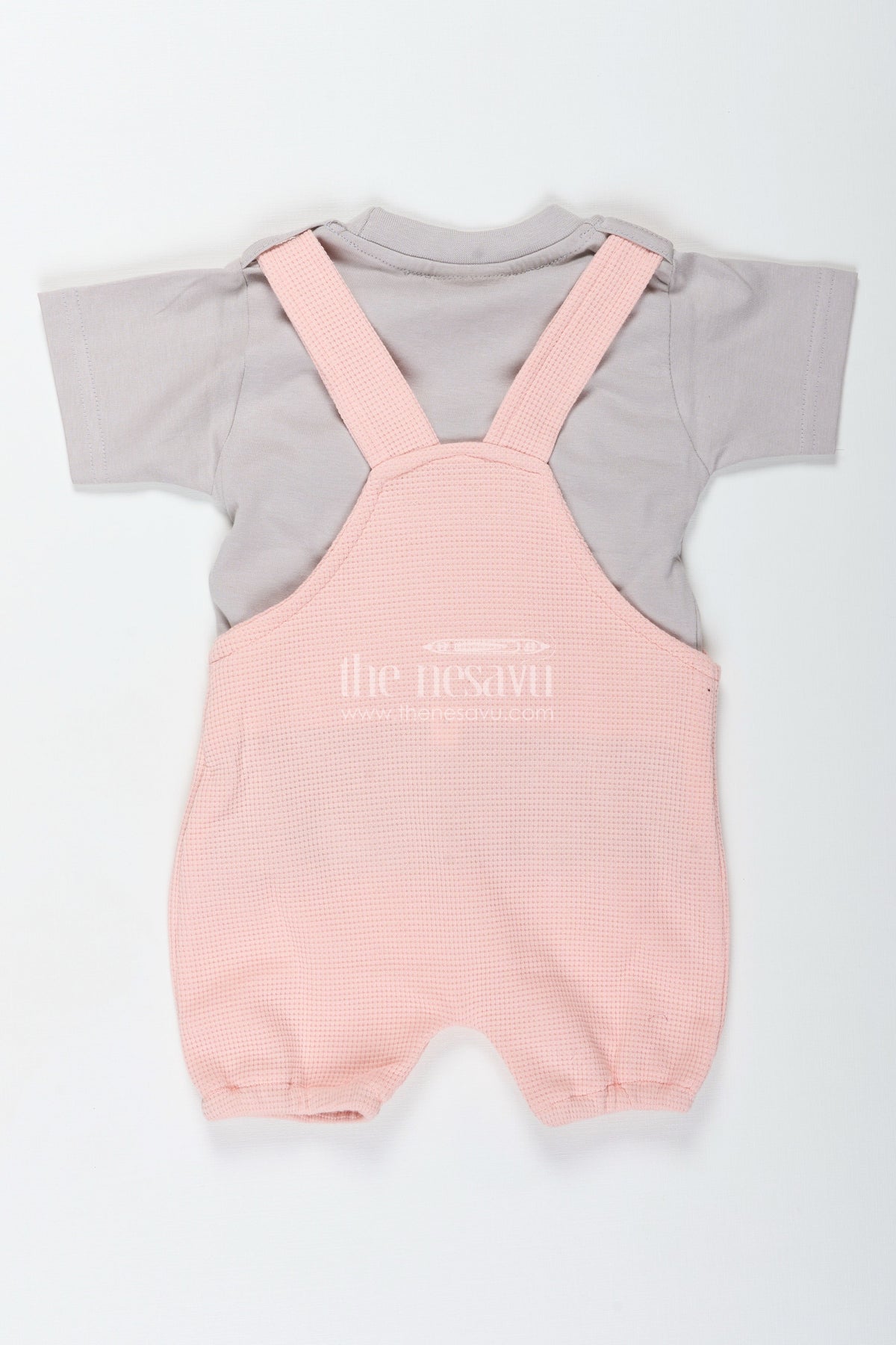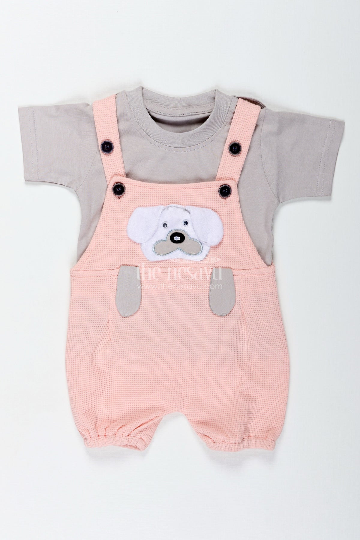 The pink casual outfit is an irresistibly cute choice for little boys who love style and comfort. Featuring a cotton waffle knit fabric that is soft and breathable, this set pairs a grey short-sleeved top with dusty pink overalls adorned with a dog patch embellishment. The texture of the waffle knit adds depth and coziness, while the playful dog design creates a light-hearted appeal. Designed for comfort and everyday wear, the outfit allows easy movement and keeps your child snug during play or naptime. With functional button closures and a neutral color palette, it’s a standout staple for casual wardrobes.