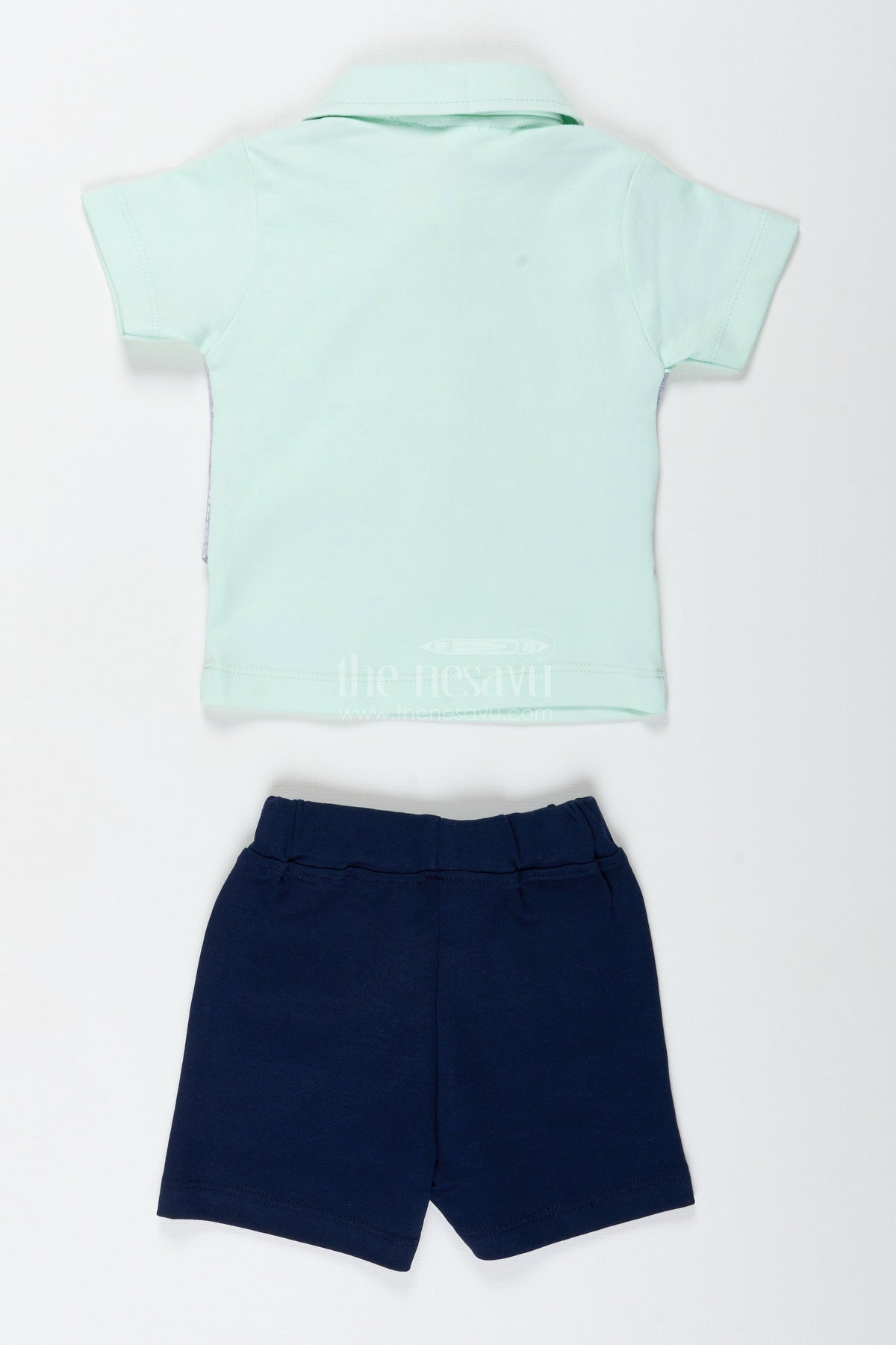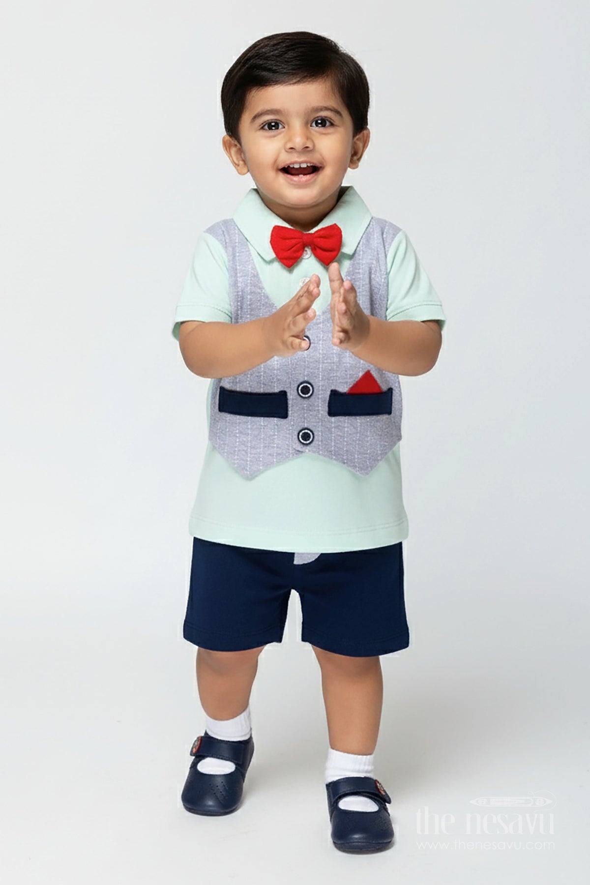 The smart cotton shirts set for boys is the perfect choice for stylish little gentlemen who love to dress sharp without compromising on comfort. Crafted from soft cotton, this outfit includes a pastel green collared shirt with a red bow tie and faux pocket square, paired with dark navy shorts for a polished finish. The breathable fabric and relaxed fit offer all-day ease, while the smart detailing adds a refined touch suitable for casual gatherings and picture-perfect moments. Whether it’s for a family brunch or playdate, this set brings charm and comfort together in one adorable package.