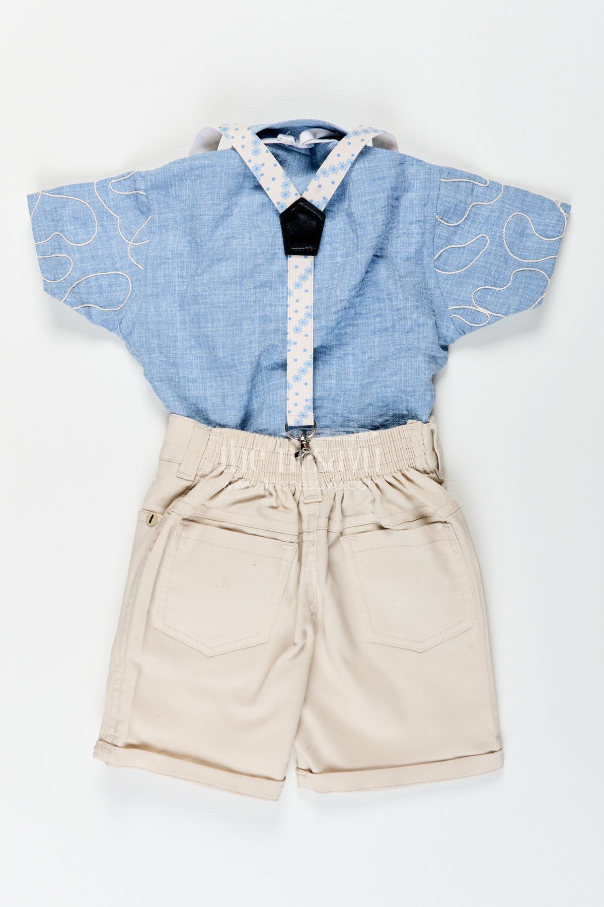 - This boys suspender outfit with embroidery and bow tie is perfect for birthday parties and stylish celebrations
