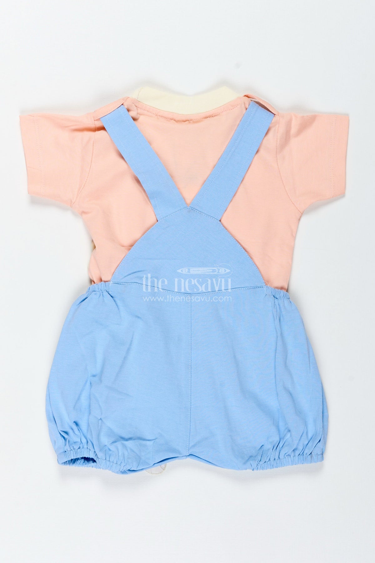 Casual blue set outfit is a refreshing and fun everyday option for your baby boy. This cotton outfit features a soft blue dungaree with a cute bunny face embroidery and comes with a contrasting peach-colored tee. Designed for ease and breathability, it’s ideal for warm weather play or relaxed indoor days. The outfit ensures both comfort and movement flexibility with its soft fabric and roomy cut. Snap-button closures make dressing easy and quick, while the playful character design adds joy to every wear. A stylish staple for your little one's casual collection.