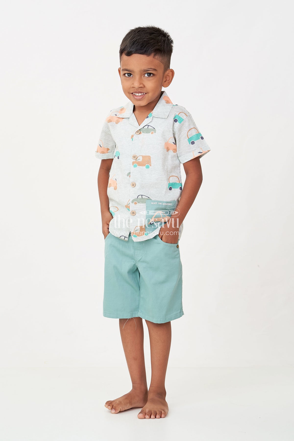 For those special evening occasions, this casual dinner outfits set by Nesavu is a stylish and cozy choice for boys. Featuring a mint green shirt with retro-style car prints and perfectly coordinated pastel green shorts, this set strikes a balance between trendy and tasteful. The soft cotton fabric ensures comfort throughout dinner gatherings or family functions, while the relaxed fit allows for ease of movement. A perfect outfit for casual dinners, holidays, or relaxed celebrations.