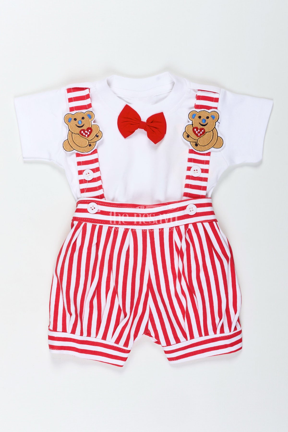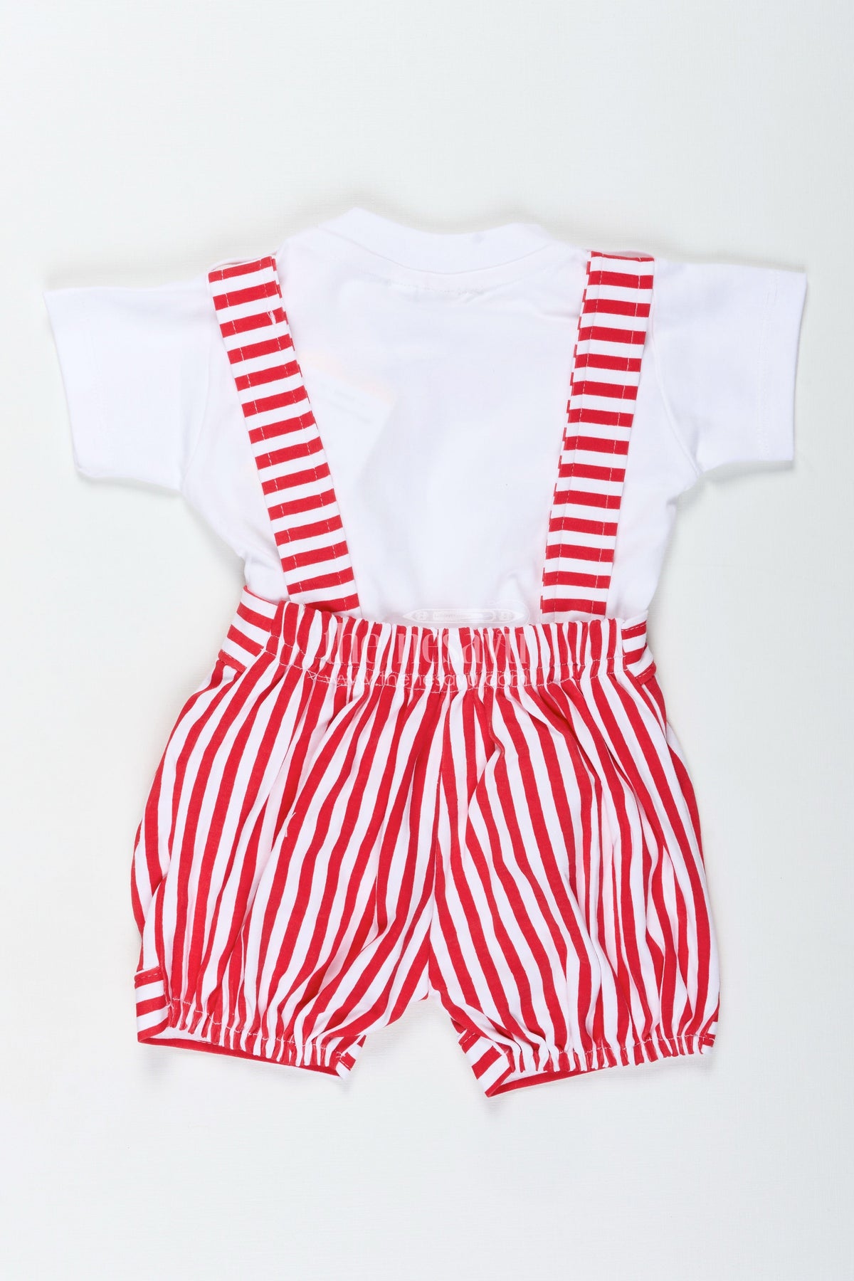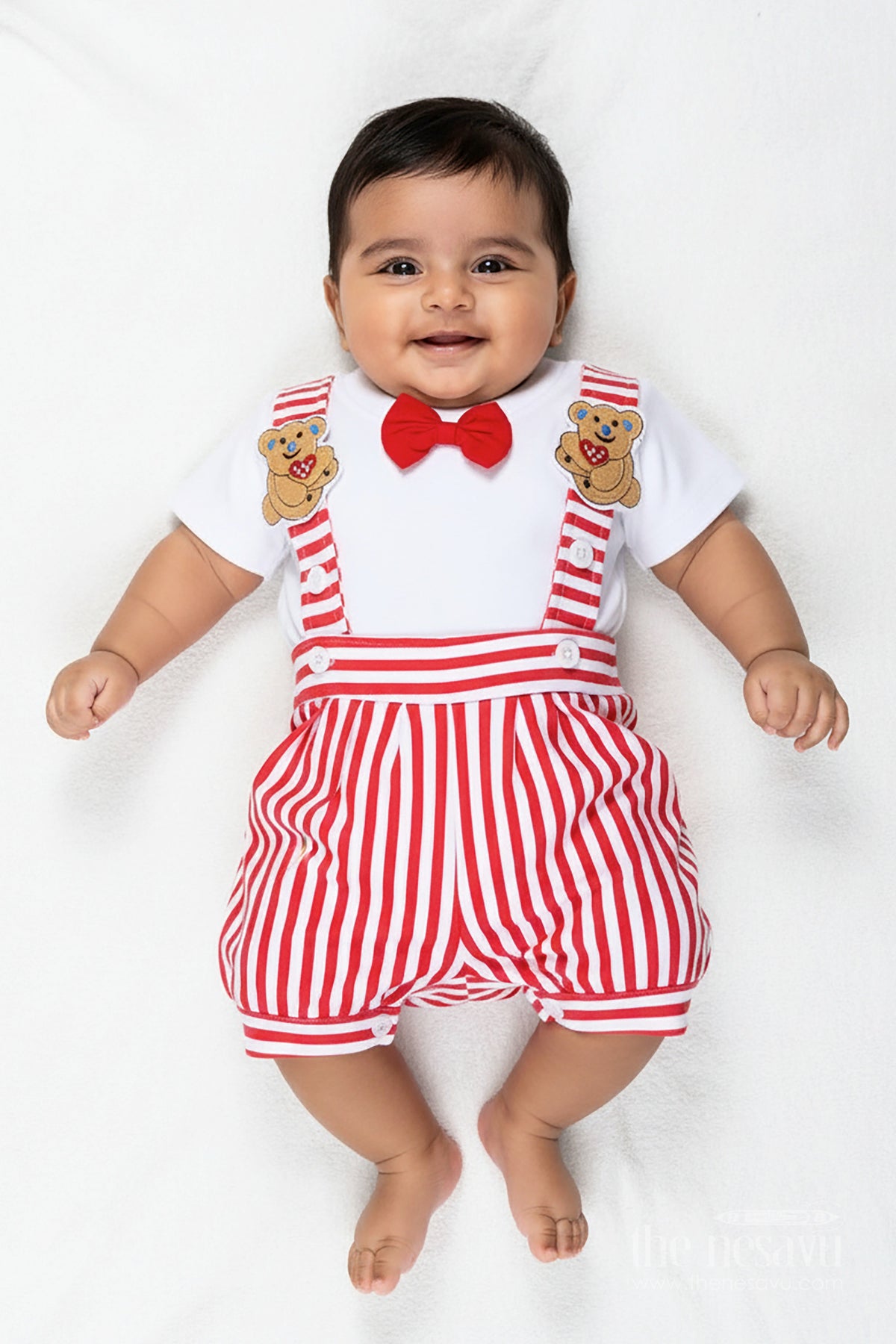 Dress Shirt and Bow for Boys in Cotton with Red Striped Dungaree and Teddy Shoulder Accents