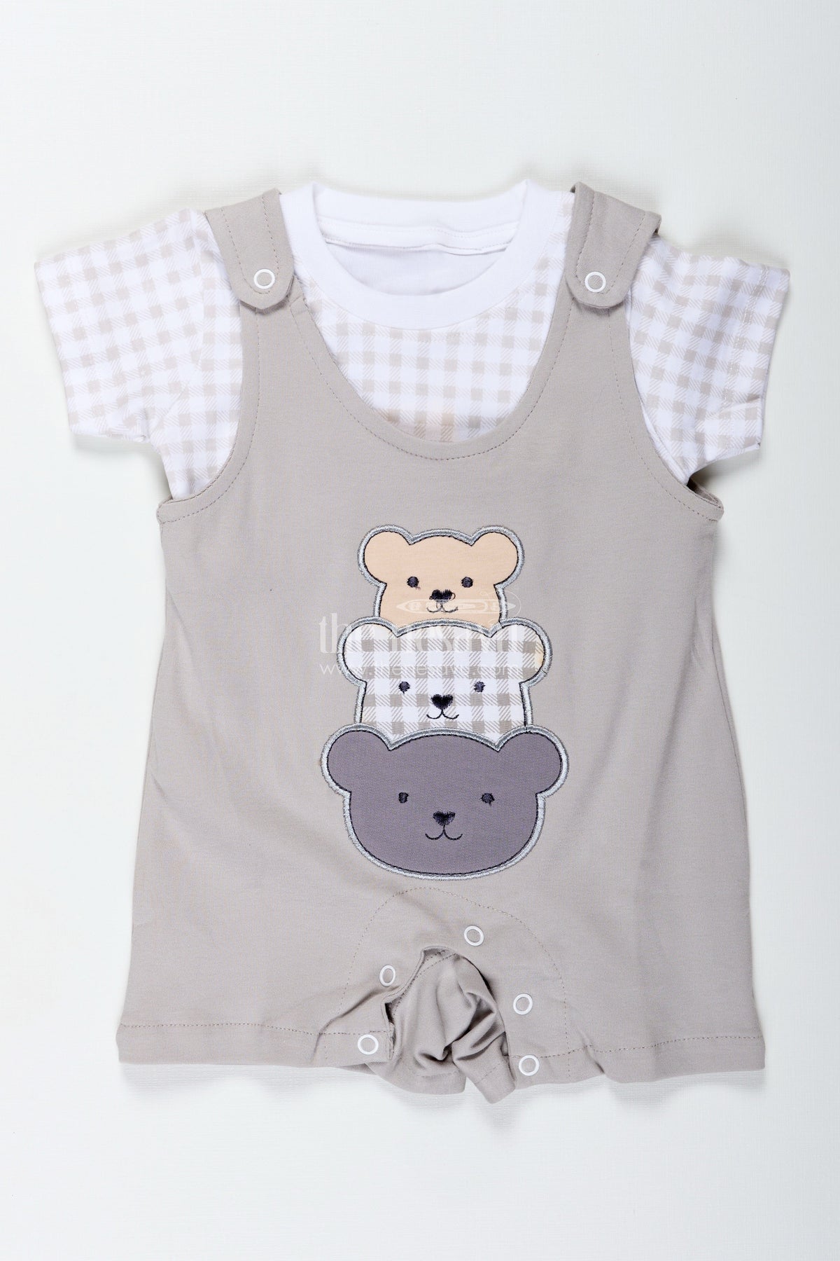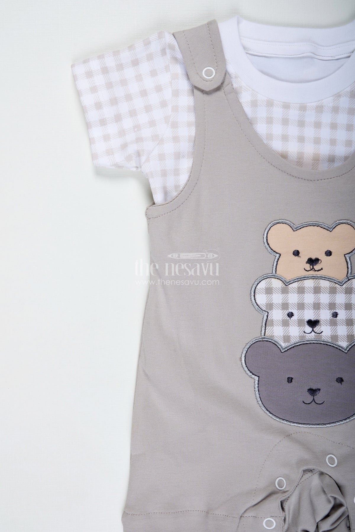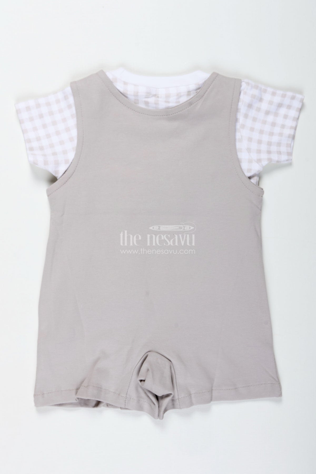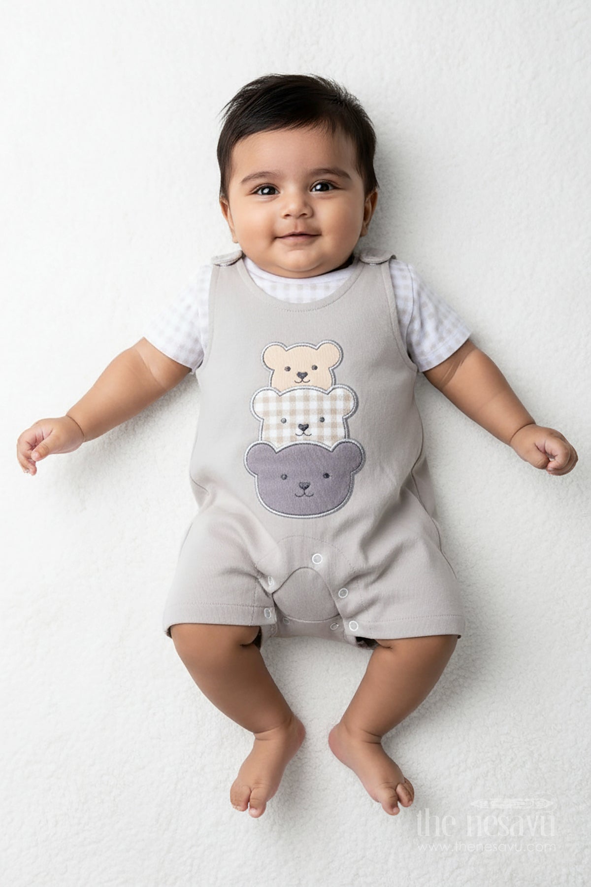 Gray casual outfit is a modern twist on babywear, combining soft cotton comfort with classic detailing. This two-piece set includes a light gray dungaree with a sweet teddy bear applique and a soft checkered short-sleeve tee. Ideal for everyday outings or relaxed indoor play, the outfit balances neutral tones with playful design. Crafted for comfort, the cotton material keeps your baby cool and happy, while snap-button closures provide convenience for quick changes. A great choice for parents looking for a mix of function and adorable charm in one stylish outfit.