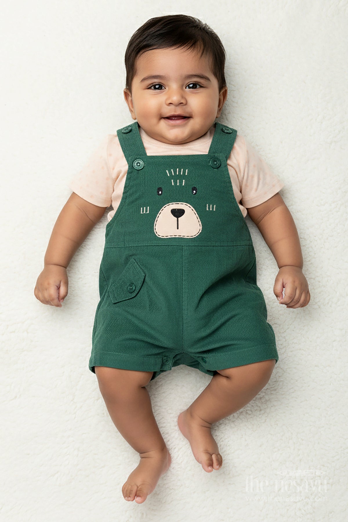 Your little one will look irresistibly cute and feel ultra-comfy in this charming green dungaree set for babies from Nesavu. The outfit features a soft beige printed T-shirt made from breathable knitted cotton jersey paired with green corduroy dungarees that sport a sweet bear face embroidery and buttoned pocket detail. Designed with gentle stretch and a relaxed fit, this set ensures comfort throughout the day—perfect for playdates or everyday outings. Easy-to-fasten shoulder buttons and fuss-free care make it a parent-approved choice. The classic color combo and adorable design offer timeless style for your baby boy.