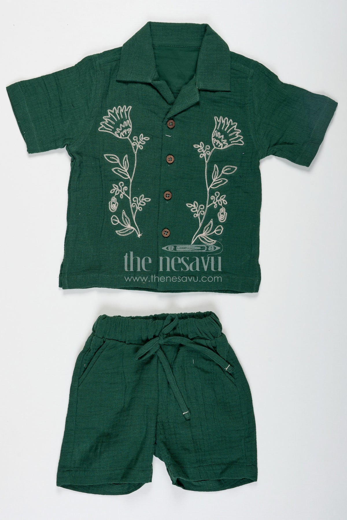 Muslin set reimagined with playful charm and breathability, this Nesavu boys outfit brings natural textures and cool vibes into everyday wear. Featuring a short-sleeve forest green shirt adorned with floral thread embroidery and paired with matching shorts, this set stands out for both comfort and style. Crafted in airy muslin cotton, it’s lightweight and skin-friendly—ideal for outdoor play, family picnics, or sunny strolls. The relaxed fit ensures easy movement while the intricate embroidery adds an artisanal touch to the overall design. Functional and fashion-forward, this muslin set helps your child look fresh and feel comfy all day long.