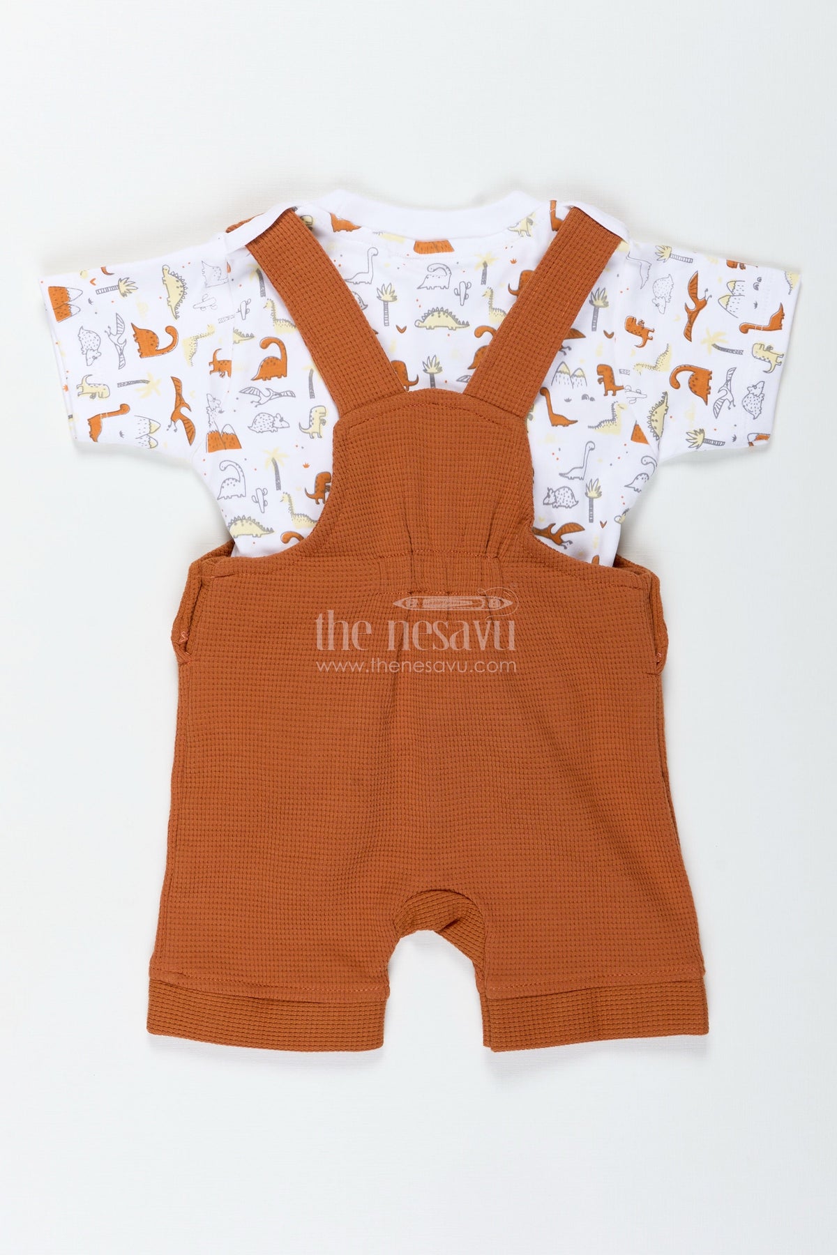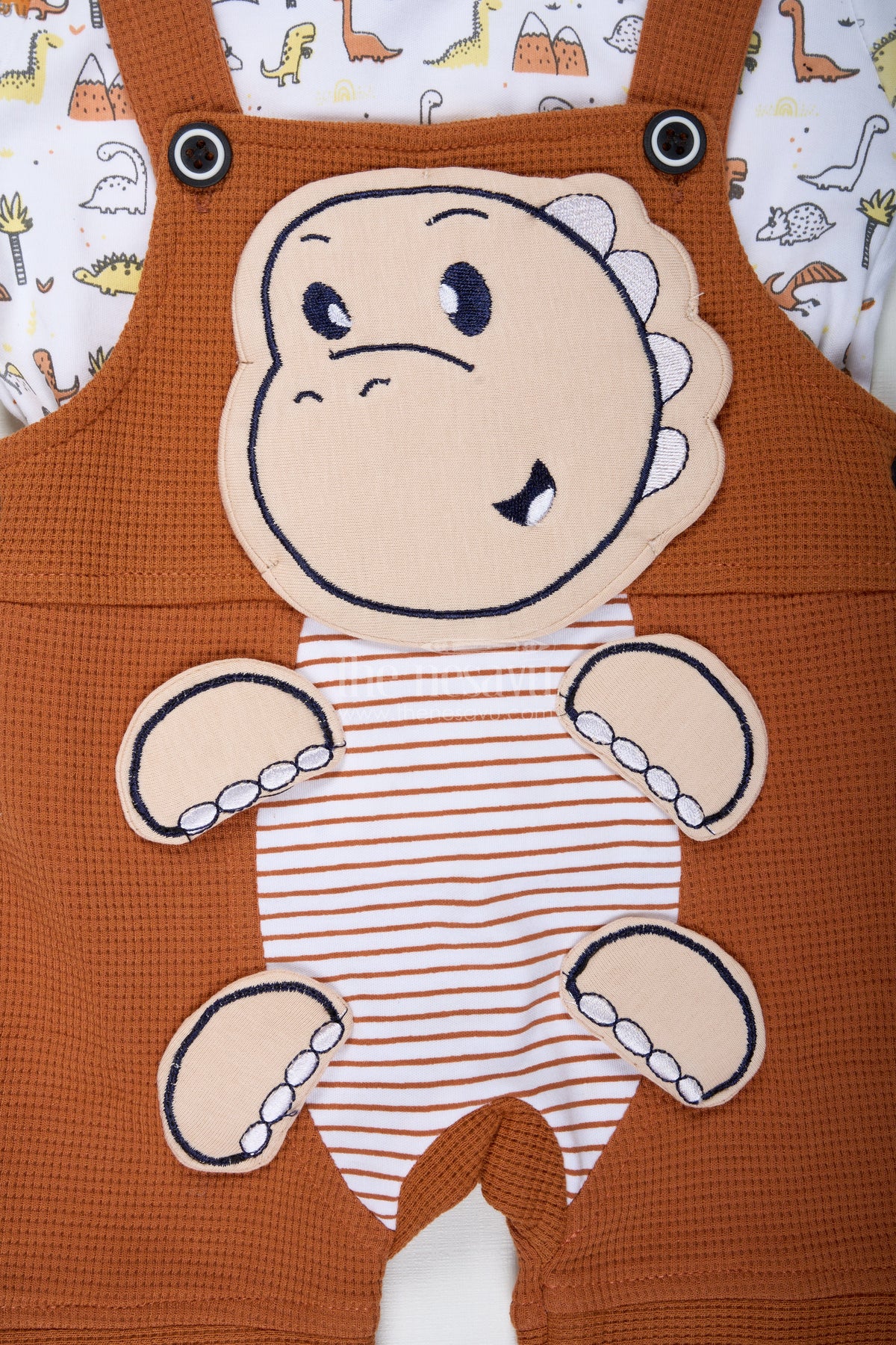 Newborn dinosaur outfit is the perfect blend of comfort and creativity for your little one’s casual wardrobe. Made from cozy cotton waffle knit, this two-piece set features a rust brown dungaree with a large dinosaur batch embellishment paired with a printed short-sleeve tee. The textured fabric offers a snug, breathable feel while adding subtle dimension to the look. The shoulder straps and snap-button bottom closure ensure ease for quick changes, while the playful dino design brings in a fun, adventurous vibe. Whether it’s playtime or naptime, this outfit keeps your baby boy comfy and charming all day long.