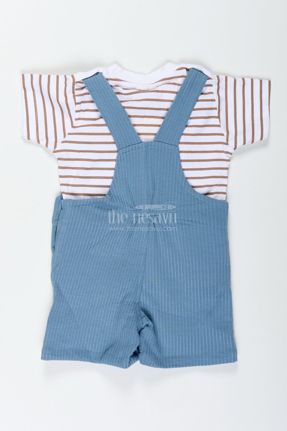 Newborn dinosaur set outfit is a delightful pick for comfort and creativity. This baby boy's set includes a soft blue corduroy dungaree with cute dinosaur batch embellishments and a striped tee to match. The gentle texture of the corduroy fabric makes it warm yet breathable - perfect for newborns. Adjustable shoulder straps and easy snap-button closures provide convenience for quick changes. The dino-themed appliqués add a whimsical, playful feel to the outfit, making it a standout piece in any baby’s casual collection. With its vibrant design and functional wearability, this outfit is ready for indoor fun or outdoor adventures.