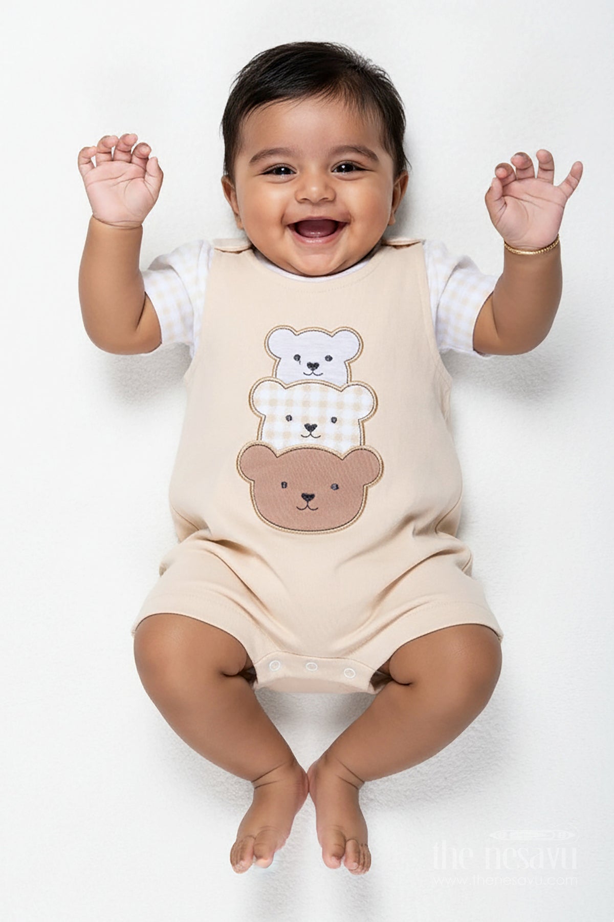 Newborn teddy bear costume is a cuddly and charming outfit tailored for tiny adventurers. Crafted in soft cotton, this beige dungaree features three adorable teddy bear appliqués down the front and pairs with a cream and green checkered short-sleeve tee. The breathable fabric and relaxed fit ensure comfort for newborns, while the subtle color palette adds a classic touch. Ideal for everyday comfort or fun photo moments, the outfit comes with convenient snap buttons for effortless dressing and diaper changes. It’s a cozy and stylish pick for your little bear cub.