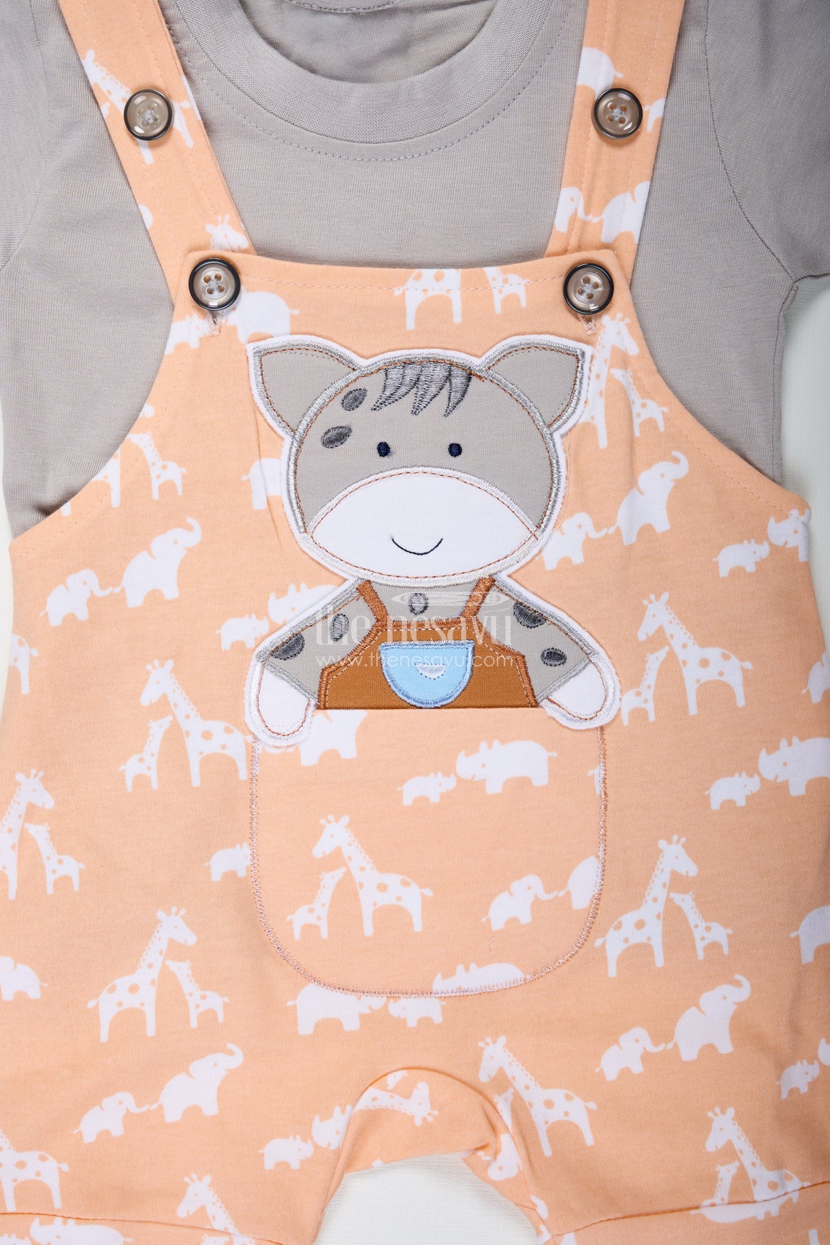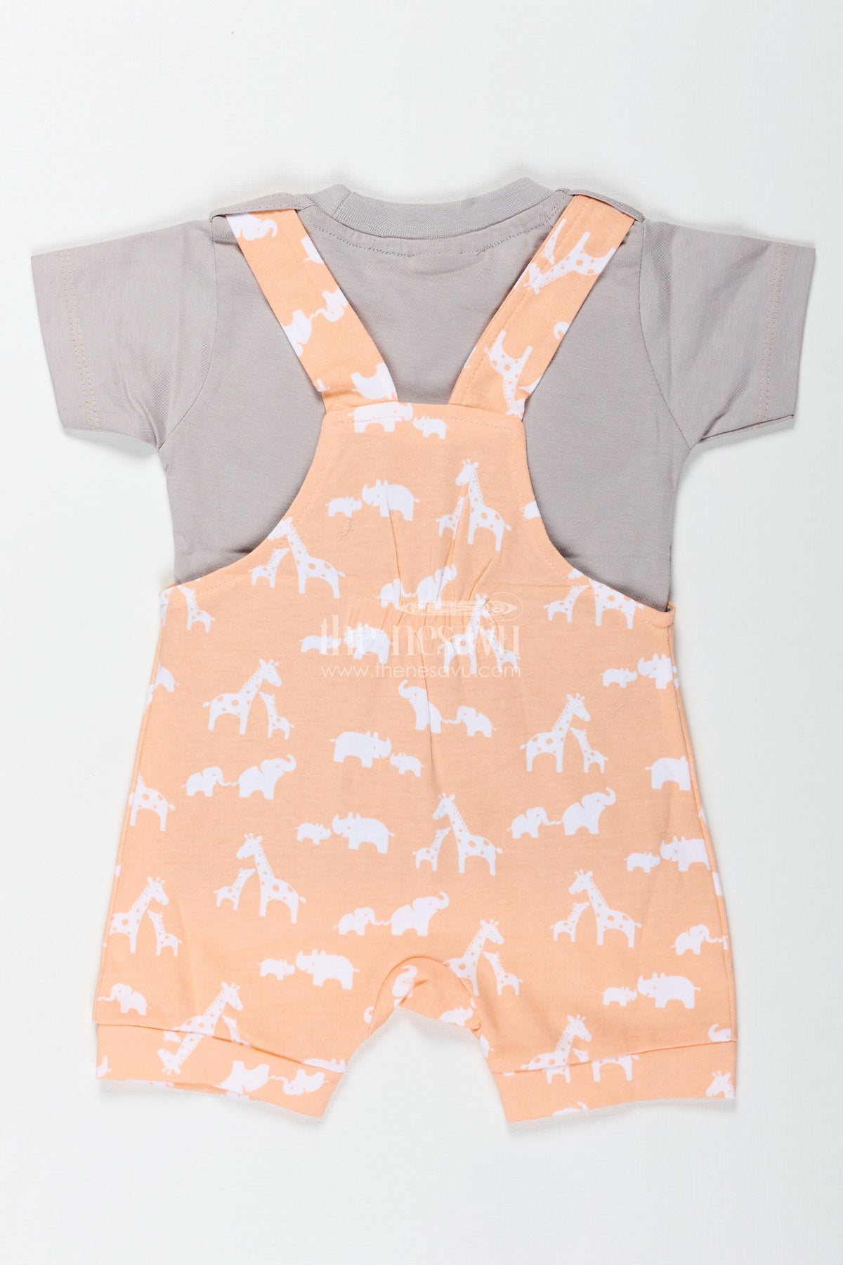 Orange casual dres for boys is an adorable outfit designed to keep your little one stylish and cozy. Made from soft cotton with delightful animal digital prints, this set features a light grey short-sleeve tee and a pastel orange dungaree adorned with a charming koala motif. The cotton fabric ensures breathability and gentle comfort on tender skin, while the easy snap-button closure simplifies dressing. Ideal for everyday play, this outfit combines playful visuals with practical comfort. Its bright yet soft color palette brings a joyful vibe that fits any casual occasion. Whether at home or out on a stroll, your baby boy will look irresistibly cute and feel comfortably free in this relaxed outfit.