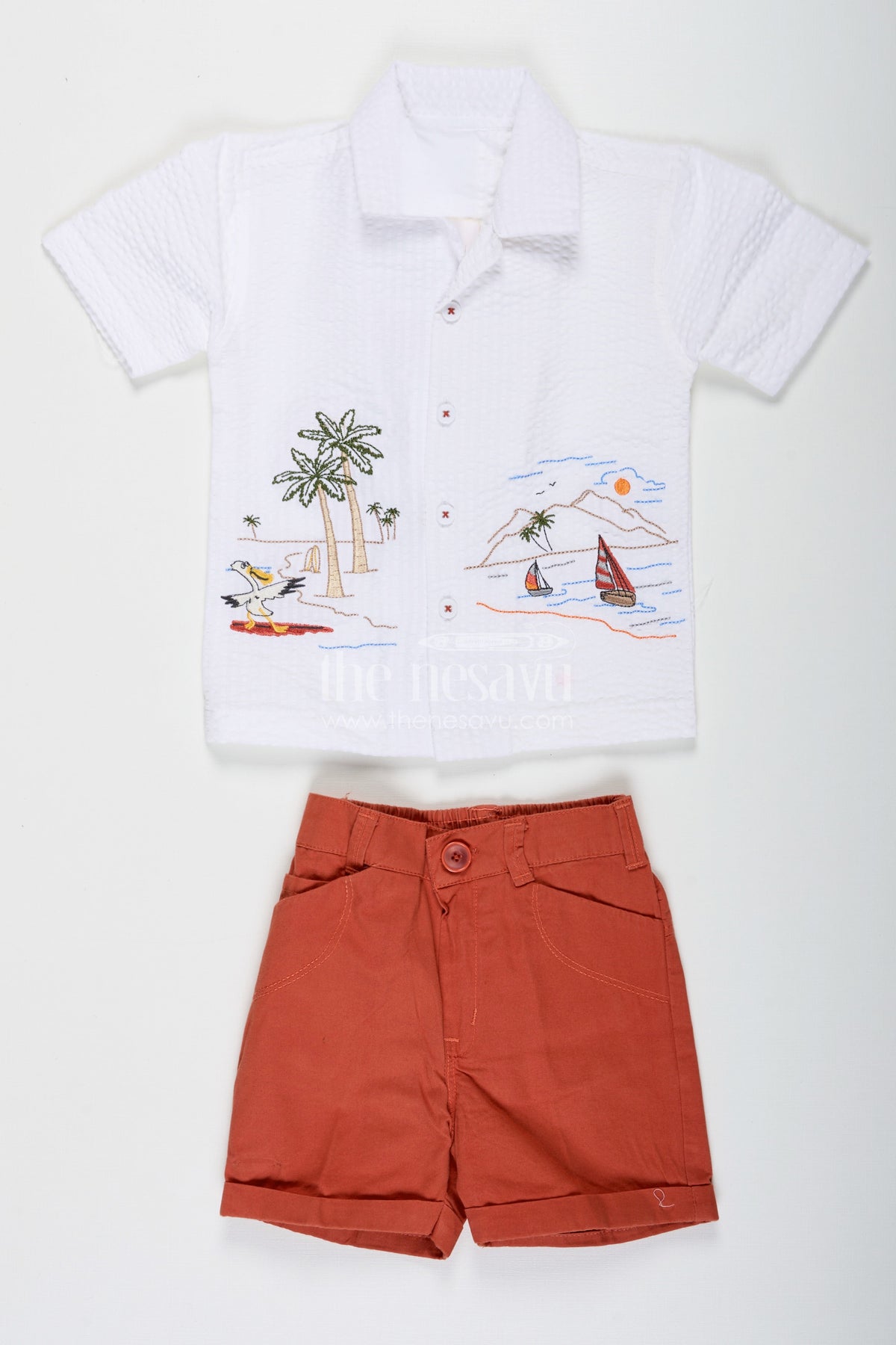 Orange traditional dress brings cultural charm and playful beach scenes together in this unique Nesavu boys’ set. Made from soft crush cotton blend, the white shirt is adorned with colorful thread embroidery showcasing palm trees, boats, and coastal landscapes—giving it a fun, storytelling aesthetic. The look is grounded with solid burnt orange shorts that provide contrast and comfort. With a breezy, textured finish, this outfit is perfect for sunny days, traditional gatherings, or vacation vibes. Easy to wear and gentle on skin, this set blends tradition and trend for stylish young boys.