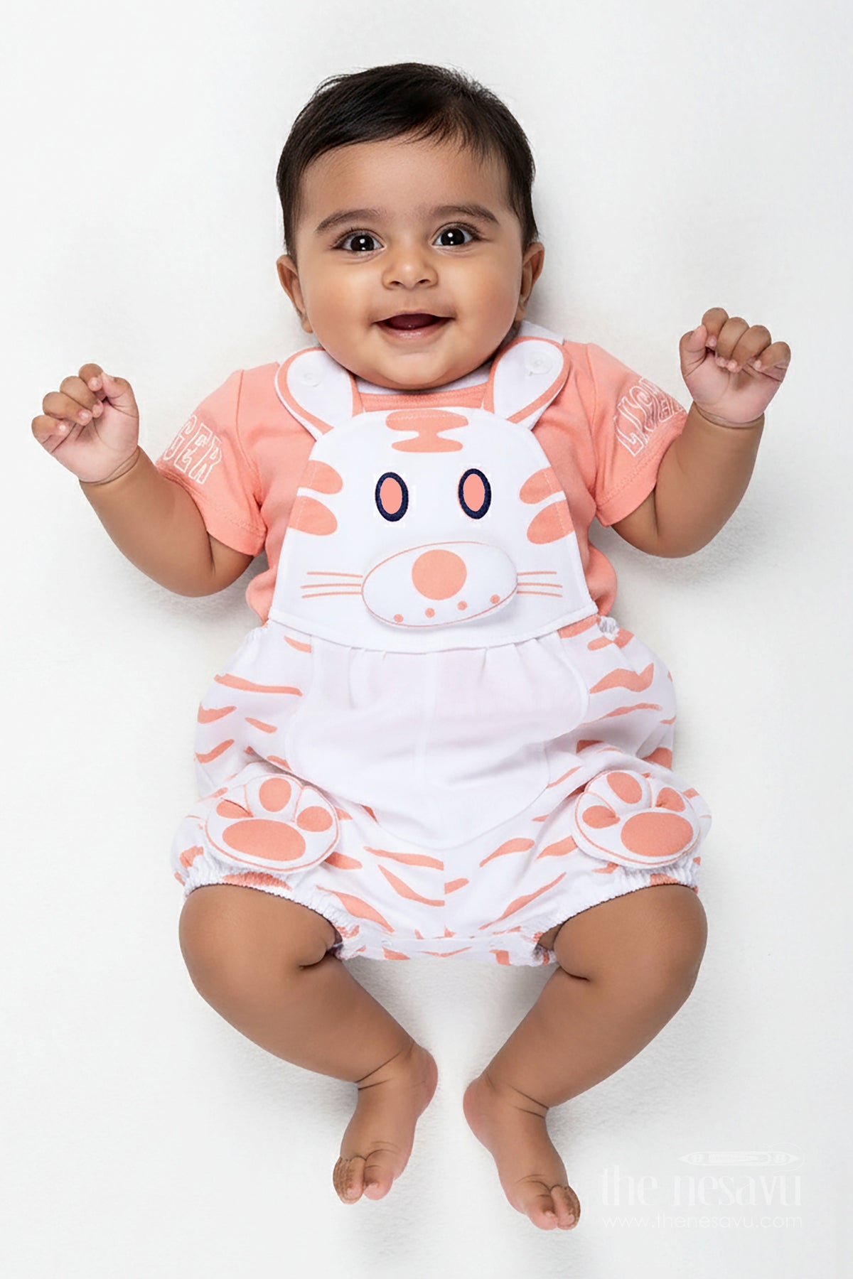 Peach Casual Outfit for Boys in Soft Cotton with Animal Digital Print and Bunny Dungaree Style