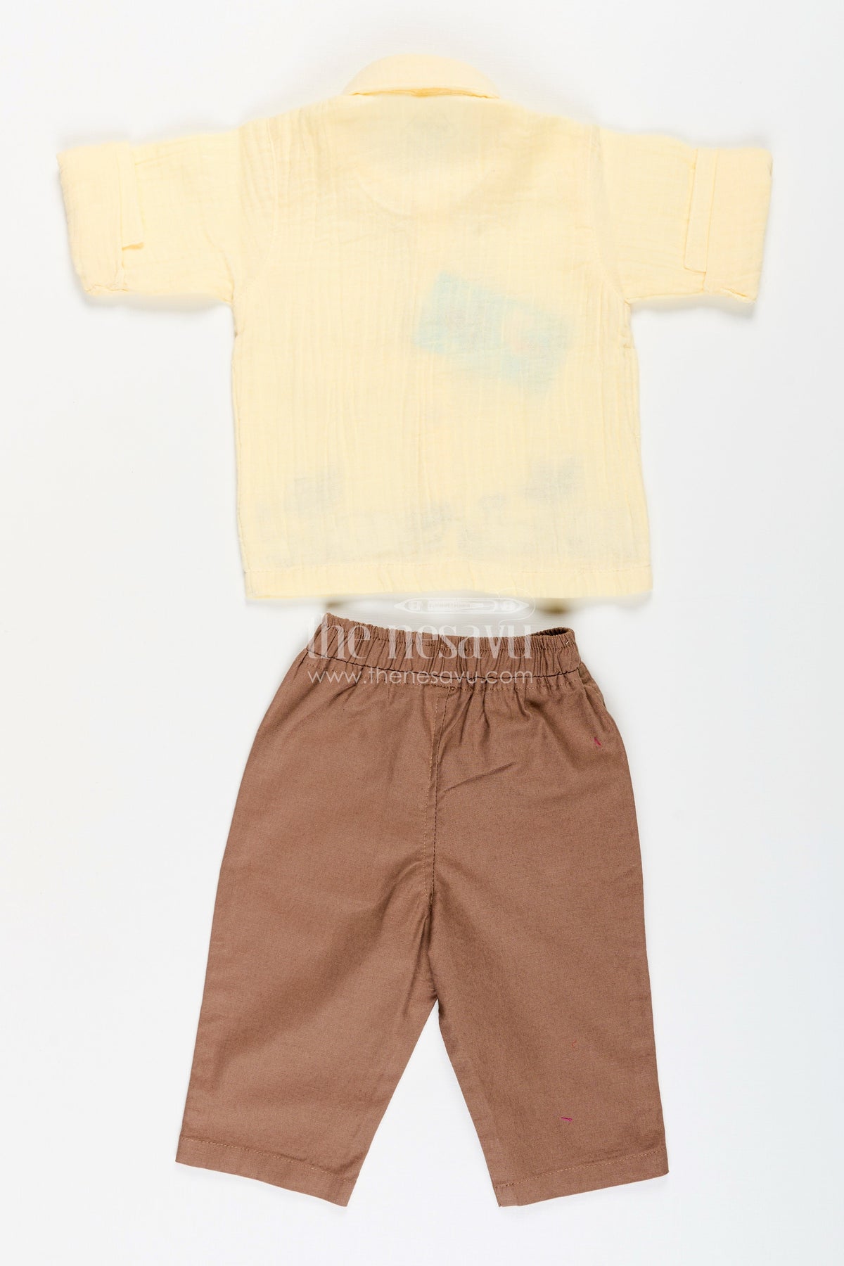 Toddler Boys Yellow Muslin Cotton Embroidered Shirt and Brown Pants Set