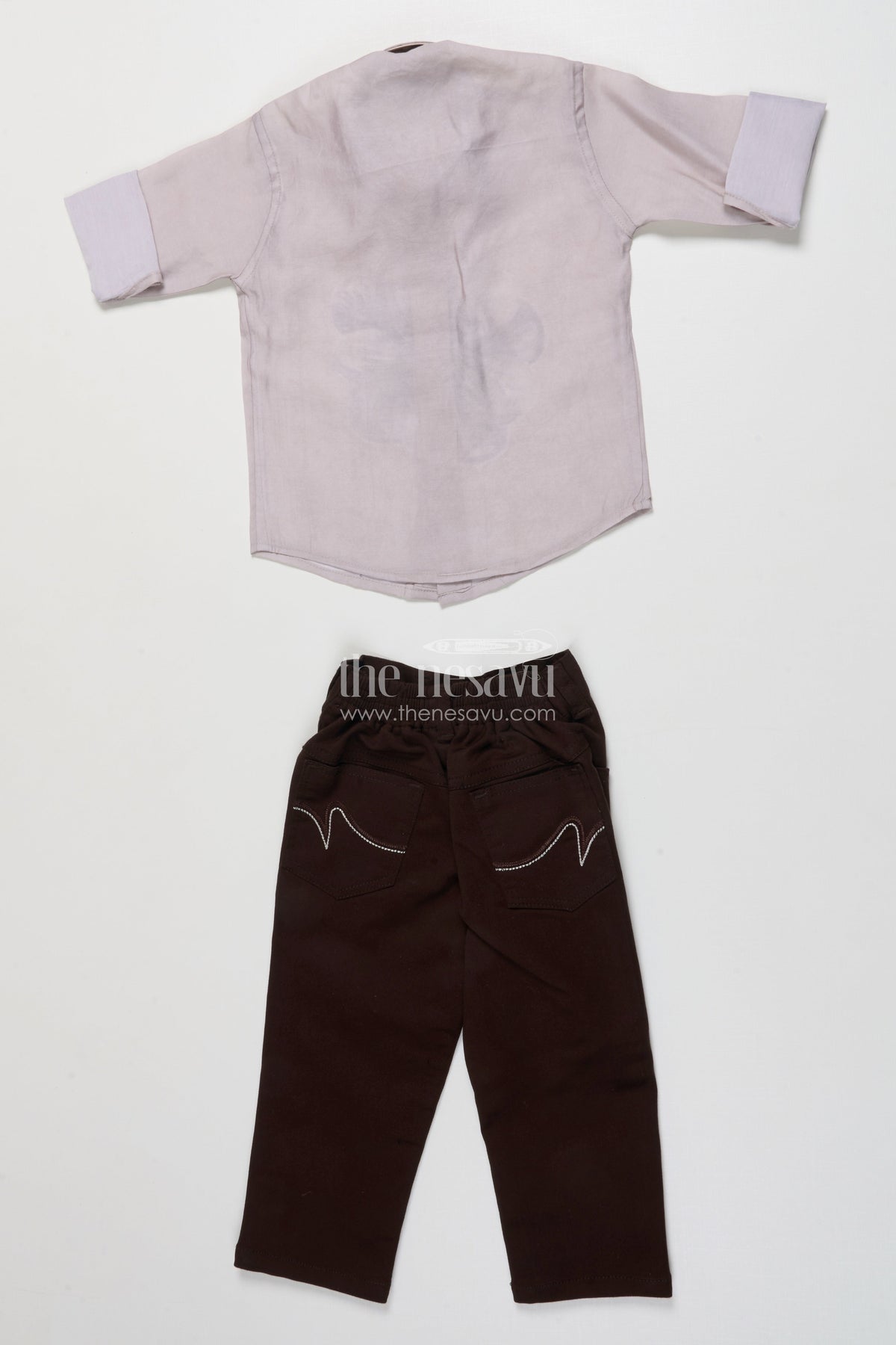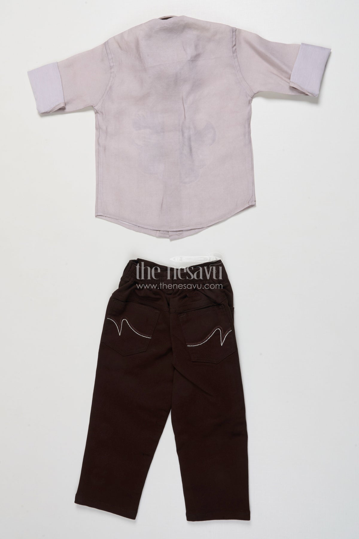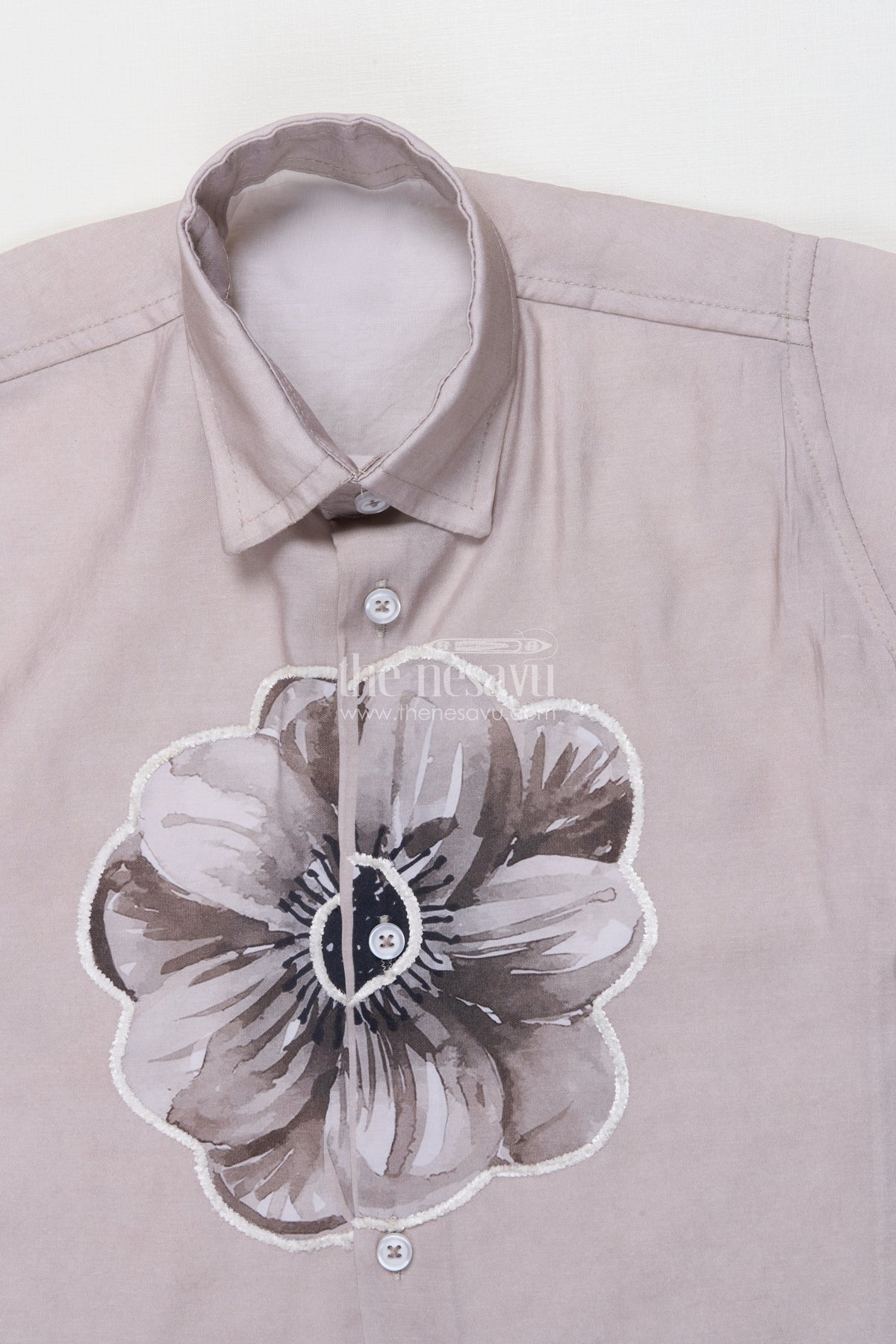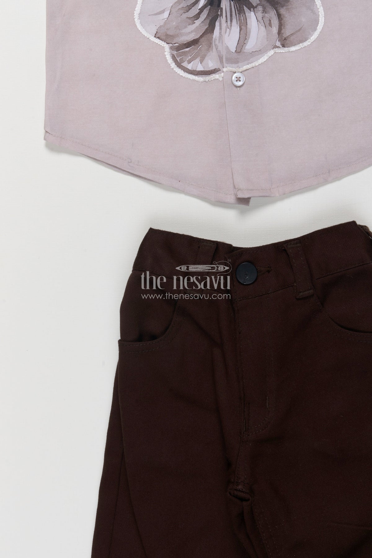 - Boys casual shirt and pant set designed with a striking floral placement print at the center