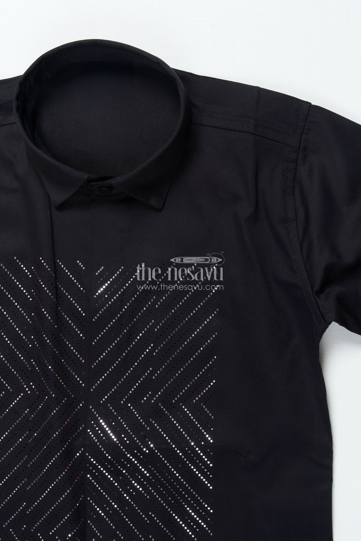 The Nesavu Boys Cotton Shirt Boys Black Shirt with Foil Detailing Party-Ready Designer Wear Nesavu Boys black shirt foil print festive designer cotton blend shirt