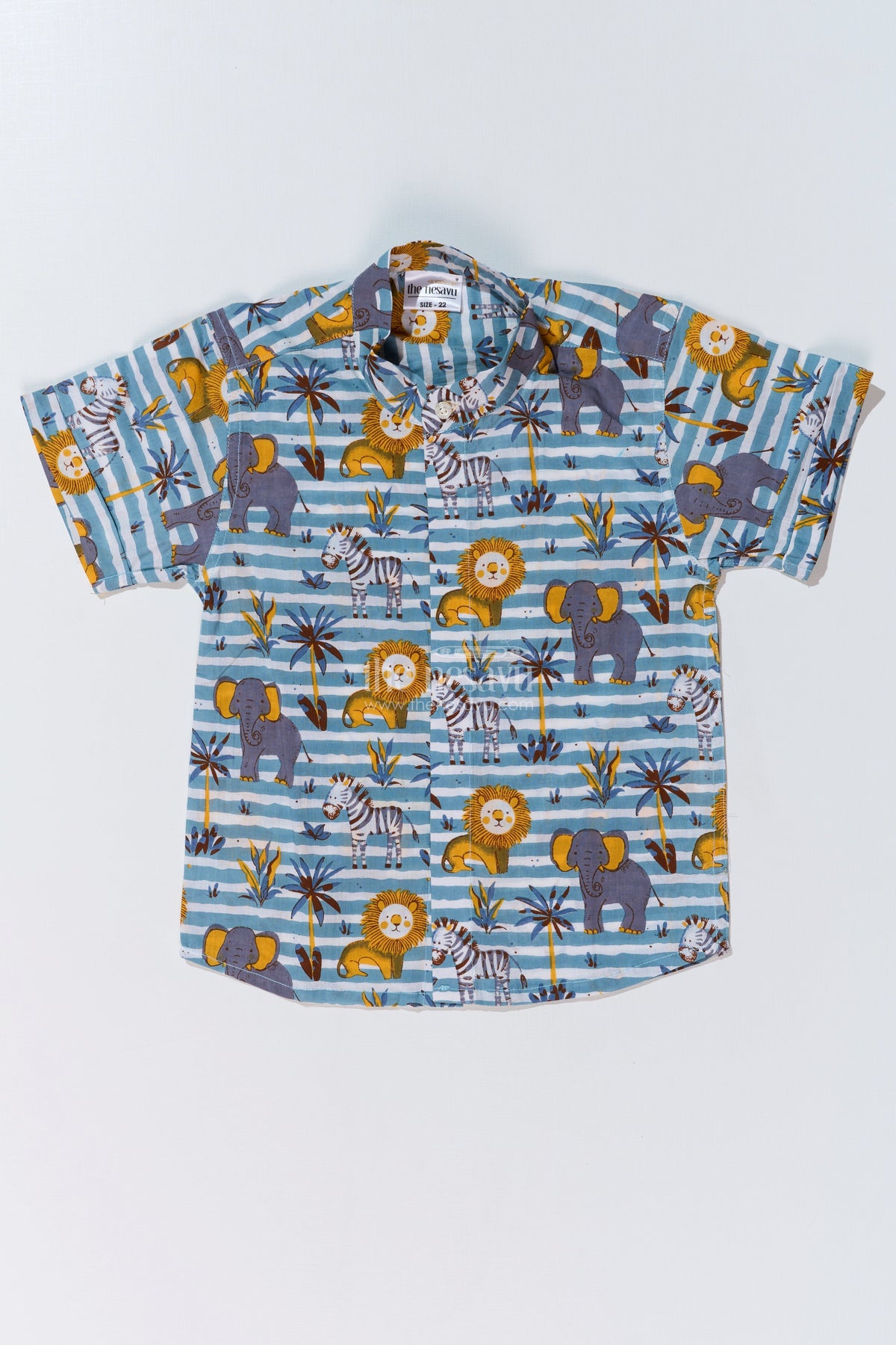This safari print cotton block shirt is a perfect choice for boys who love wildlife and adventure. Designed with a breathable cotton fabric, this half-sleeve shirt showcases a vibrant safari-inspired print featuring lions, elephants, and zebras set against a stylish blue-striped background. The lightweight material ensures maximum comfort, making it an excellent pick for casual outings, vacations, or playful days. The button-down front and relaxed fit allow easy styling with shorts or jeans, giving your child a cool and trendy look.