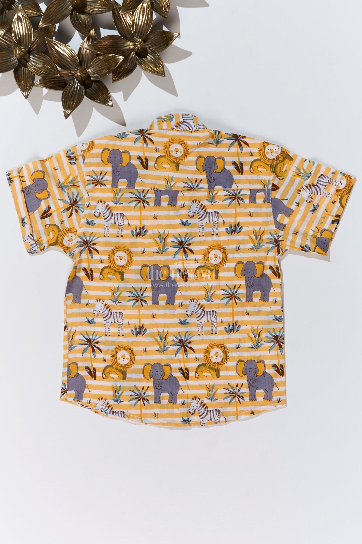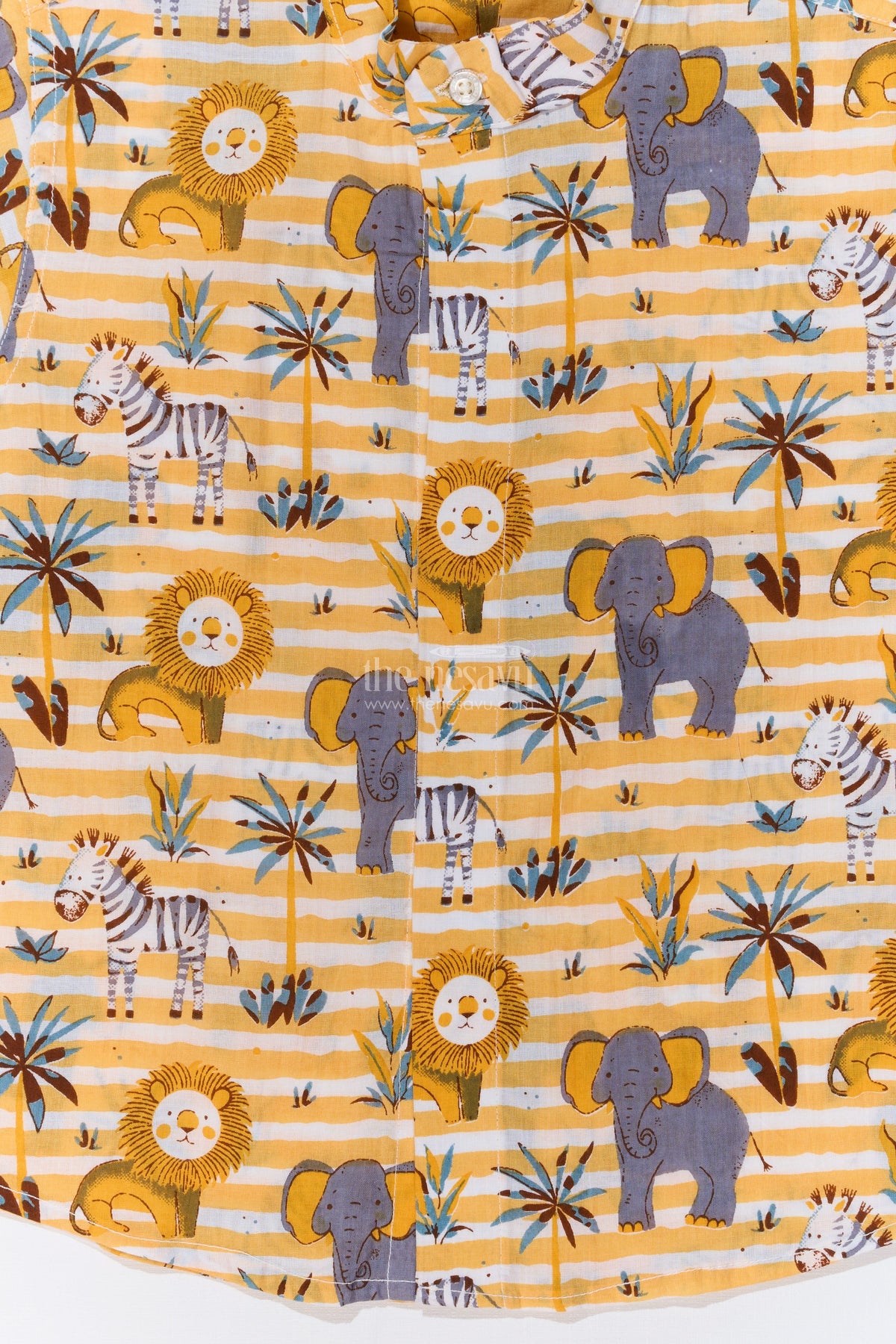 This adventurous safari-themed cotton block print shirt is a perfect choice for boys who love nature and wildlife. Made from breathable cotton fabric, this half-sleeve shirt features a playful print of lions, elephants, and zebras set against a mustard yellow striped background. The lightweight material ensures all-day comfort, making it ideal for casual outings, vacations, and fun playdates. The button-down front and relaxed fit provide easy wearability, pairing effortlessly with shorts or jeans for a stylish and comfortable look.
