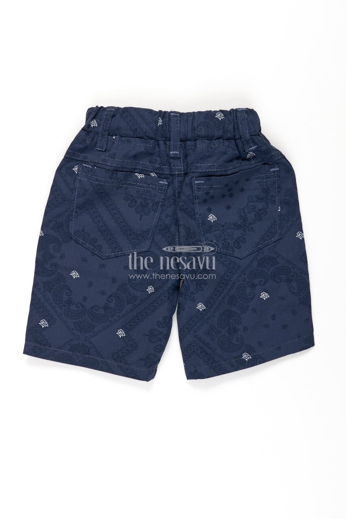 blue shorts outfit from Nesavu is the perfect combination of comfort and style for young boys. Featuring a rich navy blue tone and elegant paisley digital prints, these shorts deliver a timeless yet playful look. Crafted from breathable cotton, they offer softness against the skin while being durable enough for rough-and-tumble adventures. The elastic waistband with a white drawstring ensures a personalized, snug fit that adapts easily to movement. Deep front pockets add utility, making these shorts great for everything from school days to weekend getaways. With a polished design that pairs well with tees or collared shirts, these shorts are a reliable choice for both parents and kids.
