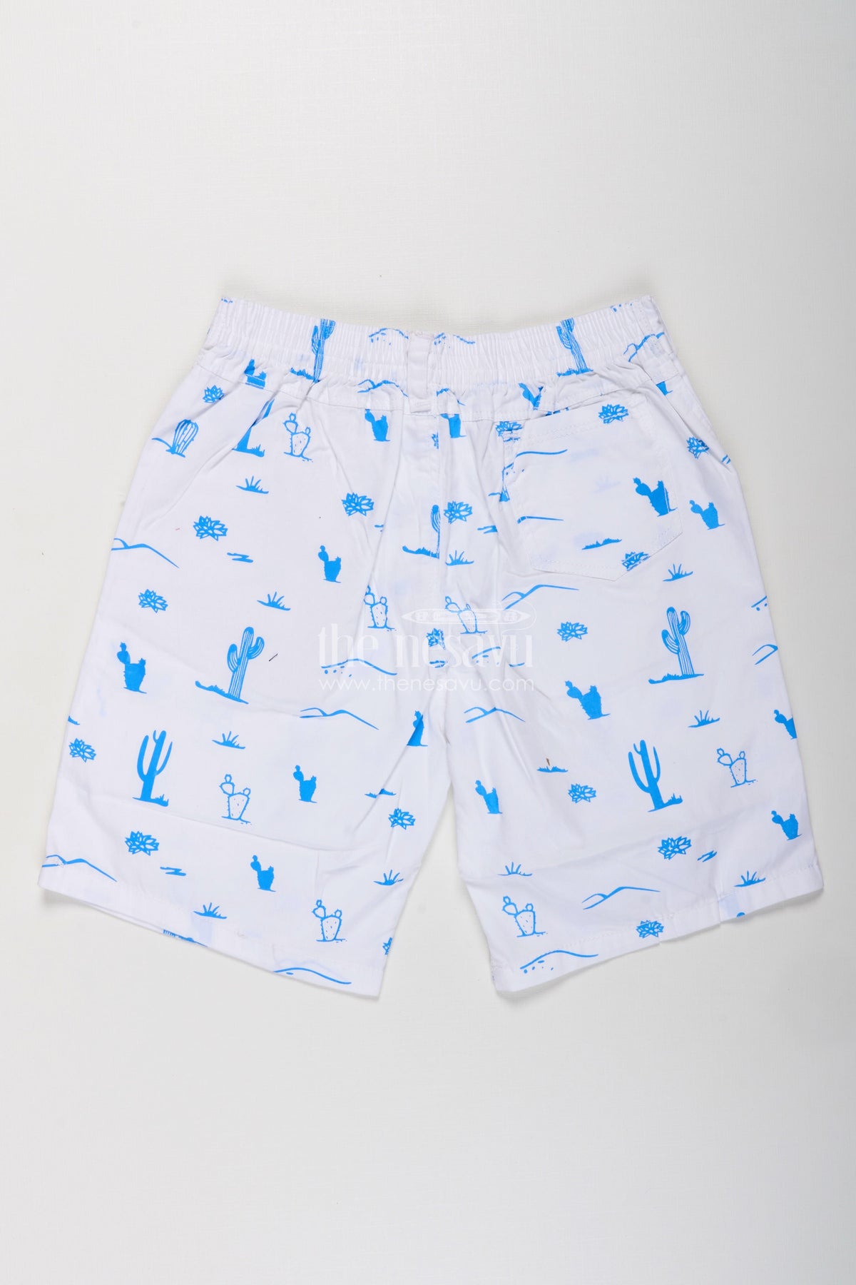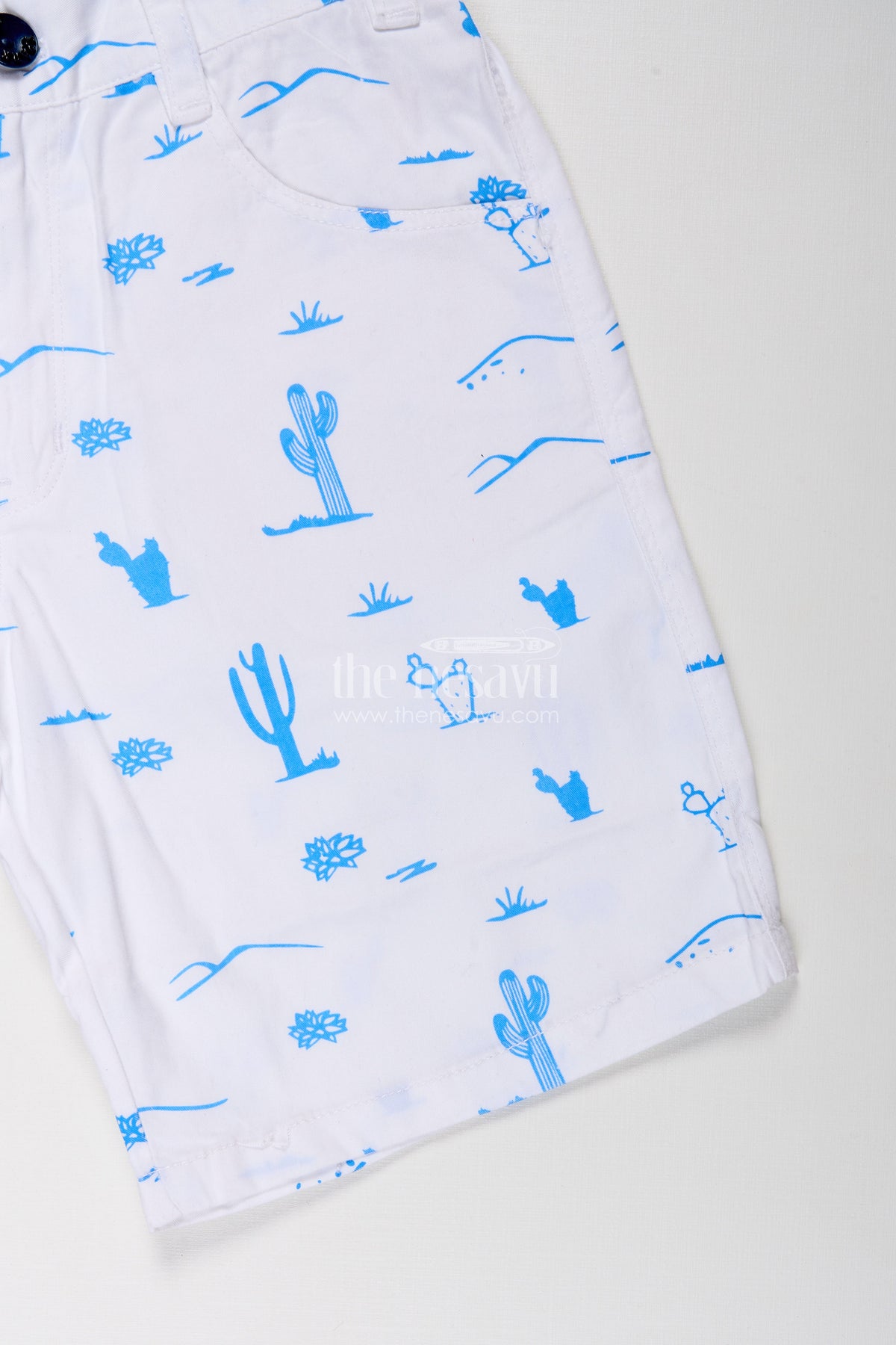 White shirt shorts from Nesavu bring playful sophistication to everyday wear with their crisp white cotton base and lively blue digital prints. Featuring whimsical cactus and animal motifs, these boys’ shorts are perfect for sunny outings and weekend adventures. The fabric is soft, breathable, and durable, ensuring day-long comfort during active play. A classic button closure and side pockets add practicality, while the clean white tone makes them easy to pair with shirts, tees, or polos. These stylish shorts are a summer must-have for boys who love fun, fashion, and freedom of movement.