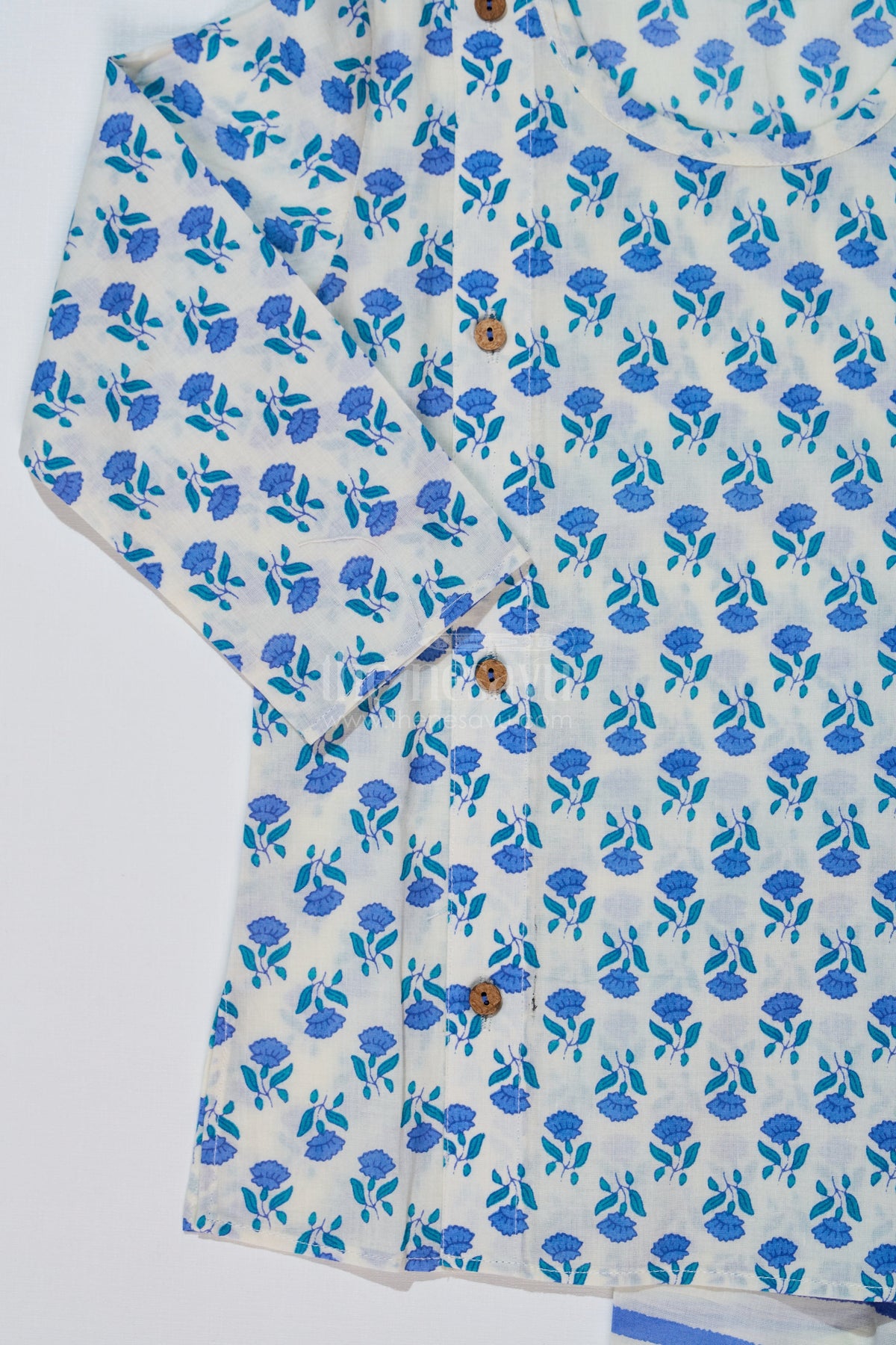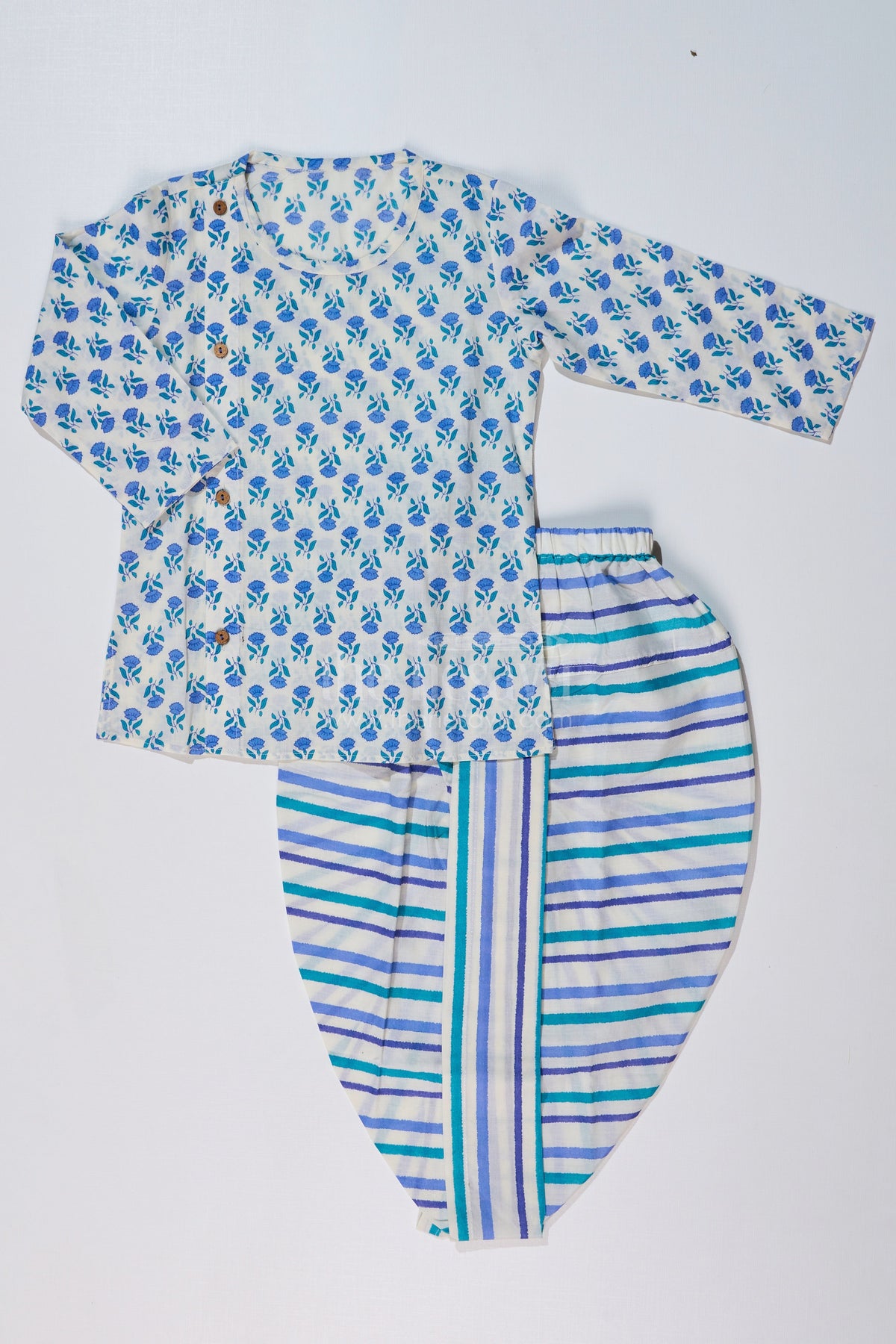 This dhoti kurta dress is a charming addition to your little one’s festive wardrobe. The cream-colored kurta, adorned with blue floral block prints, adds a touch of elegance and tradition. The soft cotton dhoti features blue and green stripes, creating a modern contrast that blends ethnic fashion with contemporary style. Lightweight and breathable, this outfit ensures ease of movement, making it ideal for temple visits, poojas, and special gatherings.